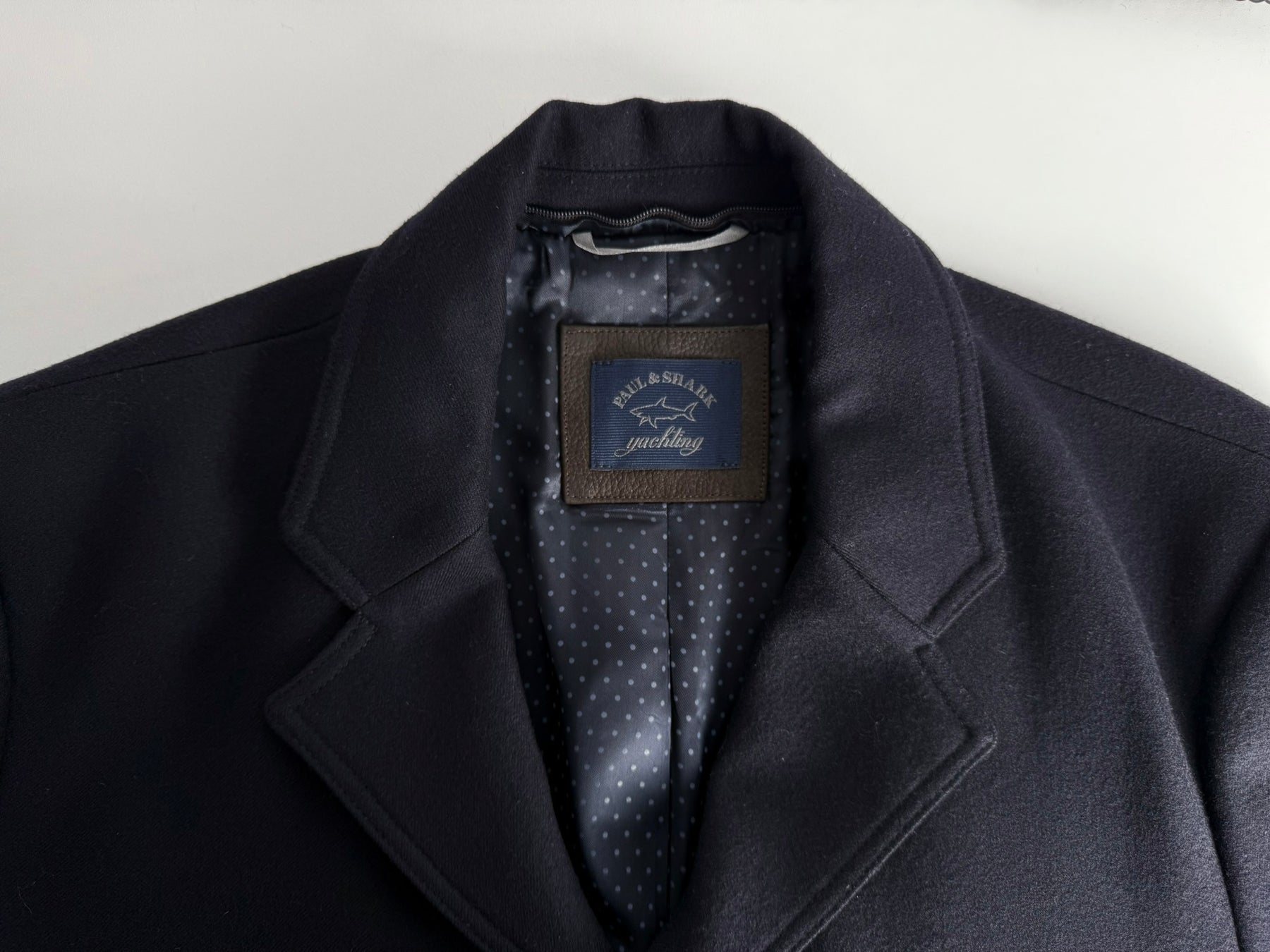 Abrigo largo de lana Paul Shark color azul oscuro talla 50 (M) en perfecto estado (prácticamente nuevo con poco uso). Gran calidad de lana con forro interior de poliéster y viscosa, cuenta con todos los botones y cremalleras originales.