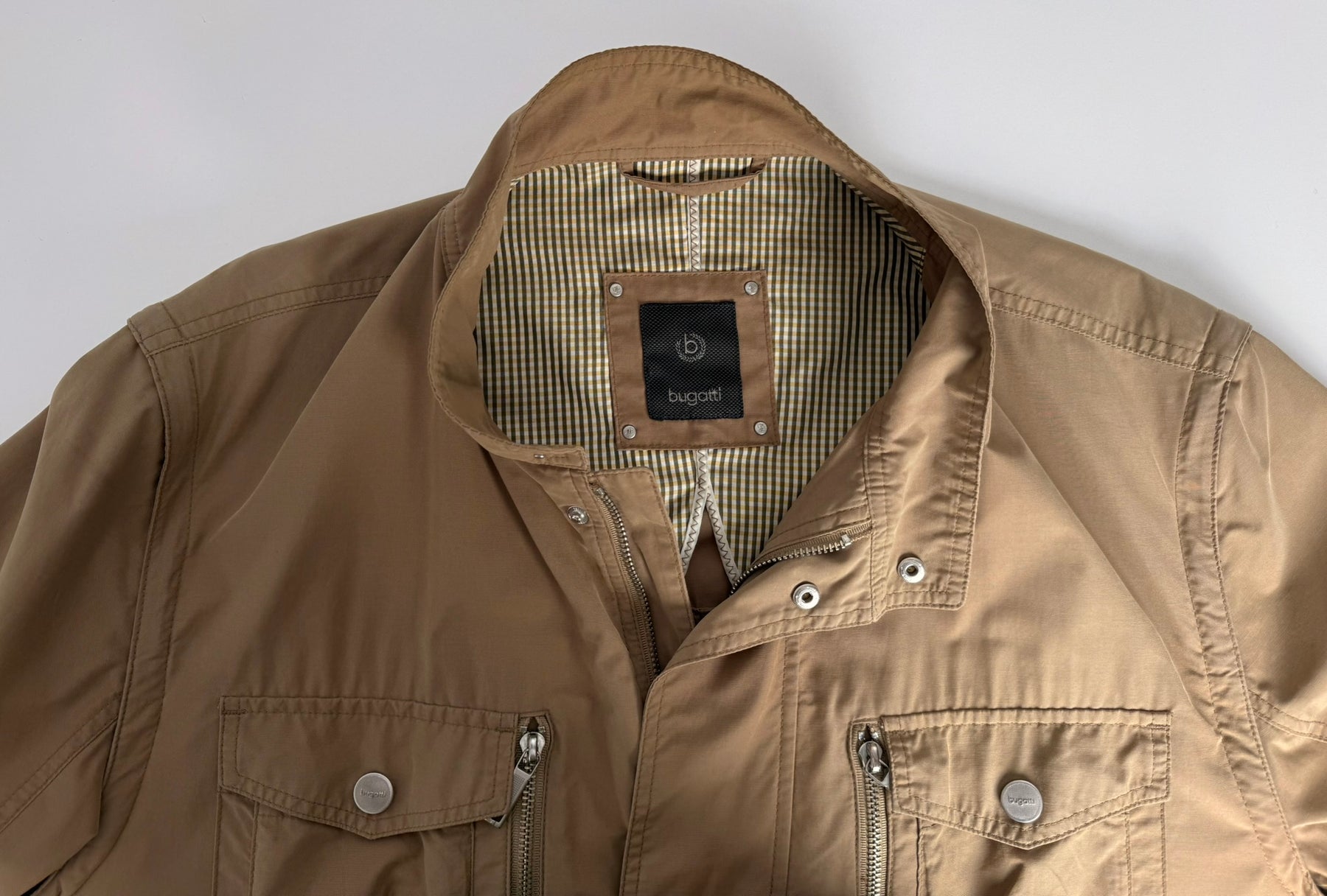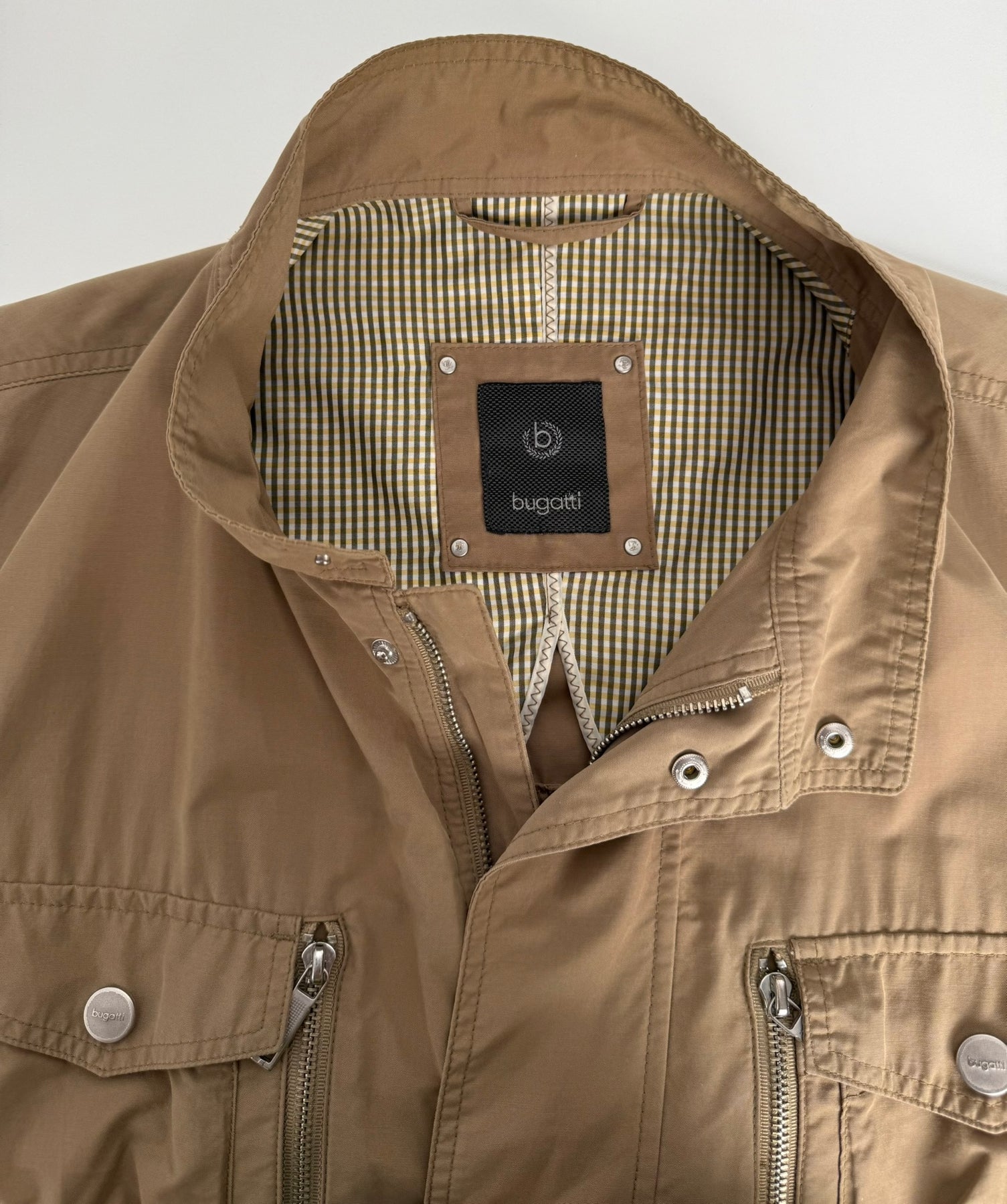 Cazadora Bugatti color camel talla 56 (XL) en perfecto estado (prácticamente nuevo con poco uso). Se le pueden quitar las mangas y hacerlo chaleco. Gran calidad de algodón y poliamida con forro interior de viscosa y poliéster, cuenta con todos los botones y cremalleras originales.