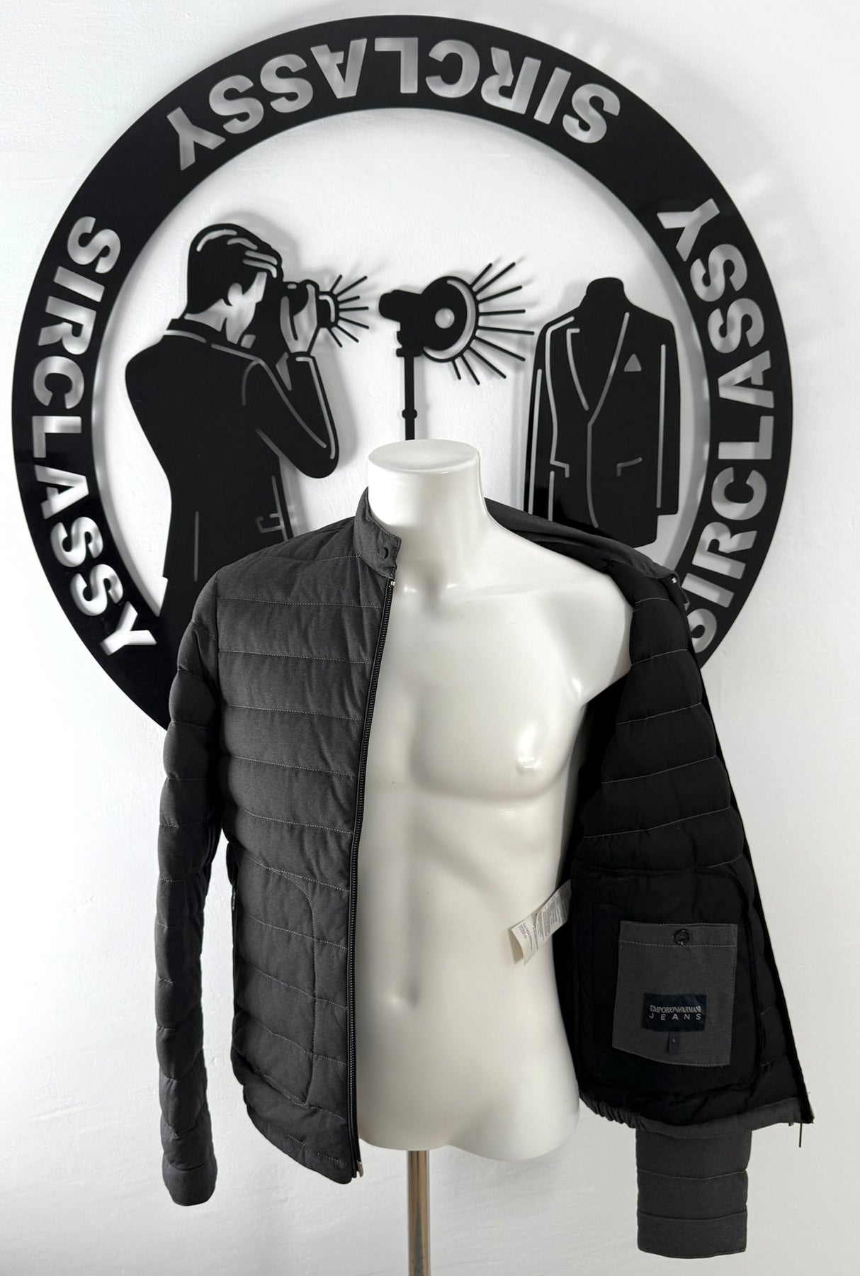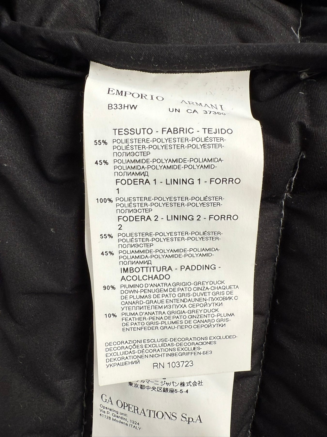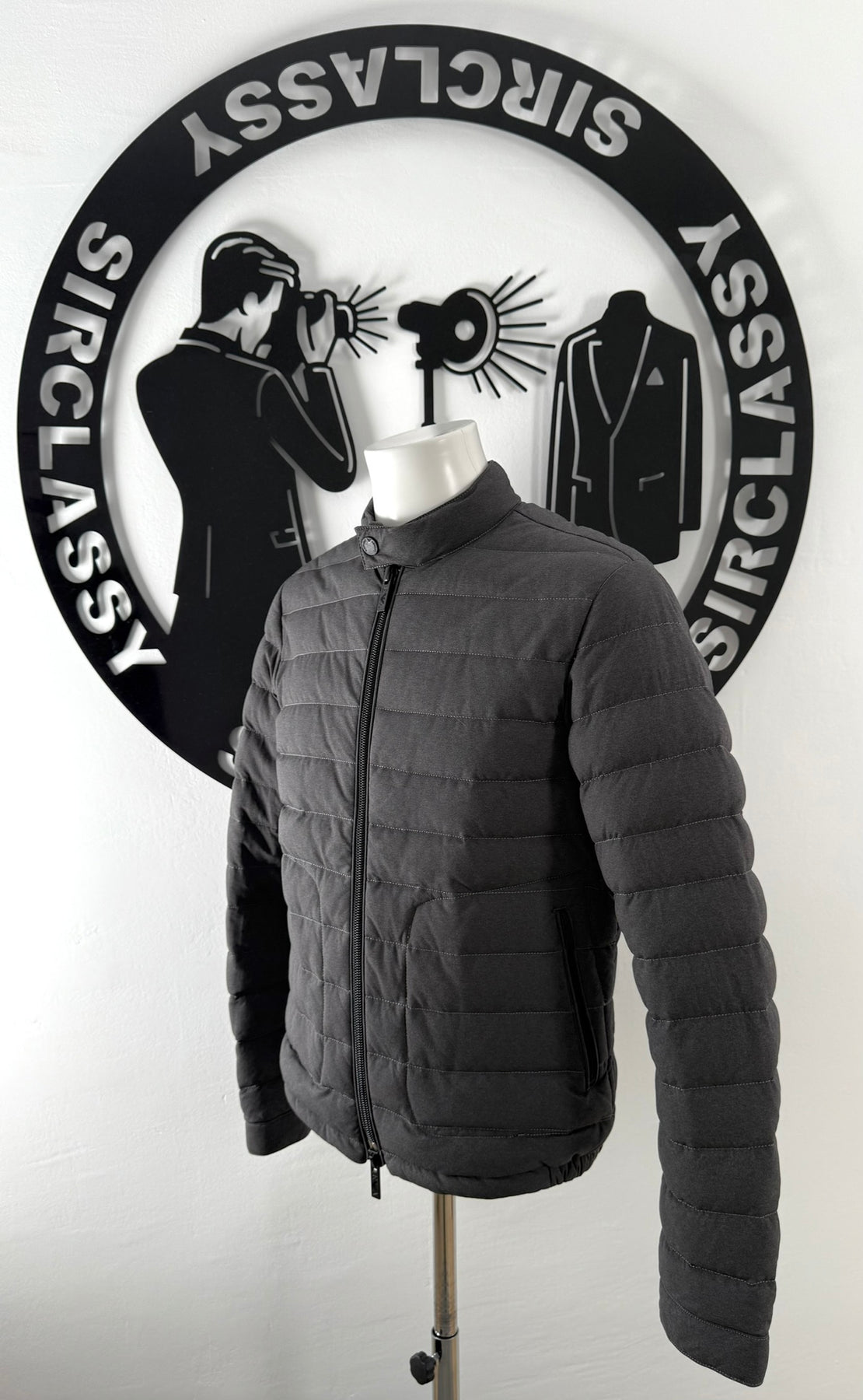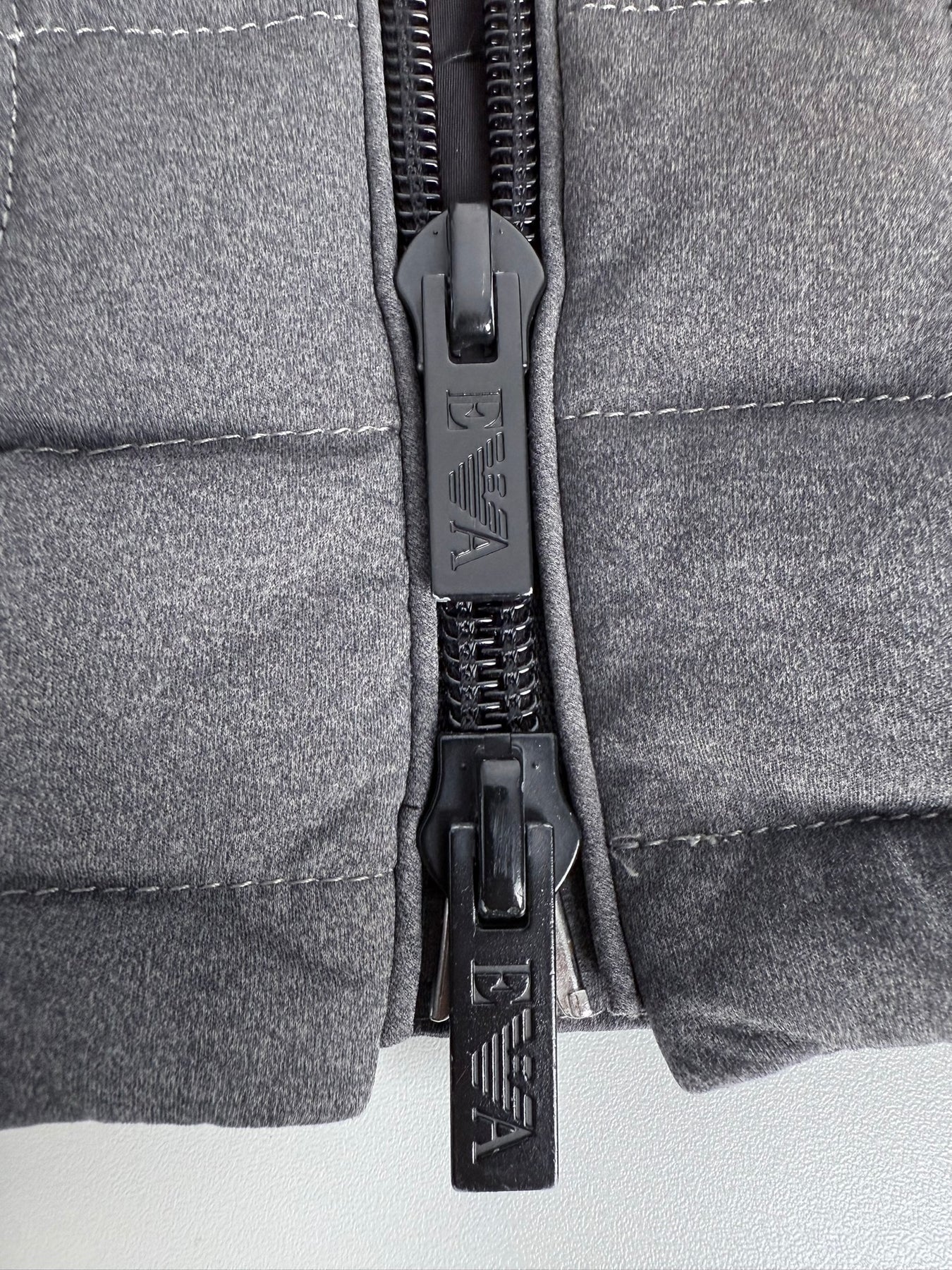 Cazadora de plumas Emporio Armani color gris talla (M internacional, aunque la etiqueta marca una L, talla más pequeño) en perfecto estado (prácticamente nuevo con poco uso). Gran calidad de poliéster y poliamida con relleno de plumas, cuenta con todas las cremalleras originales.