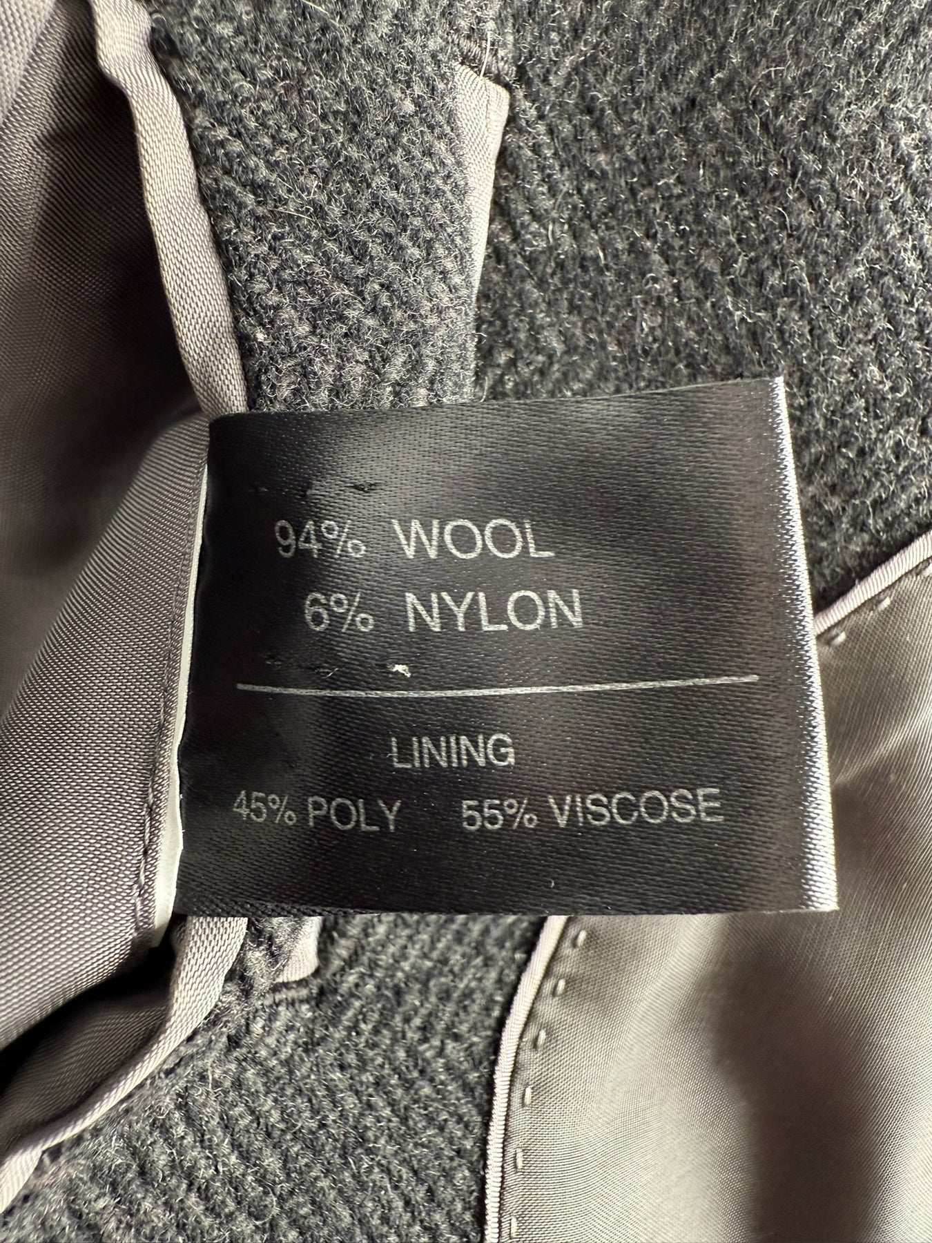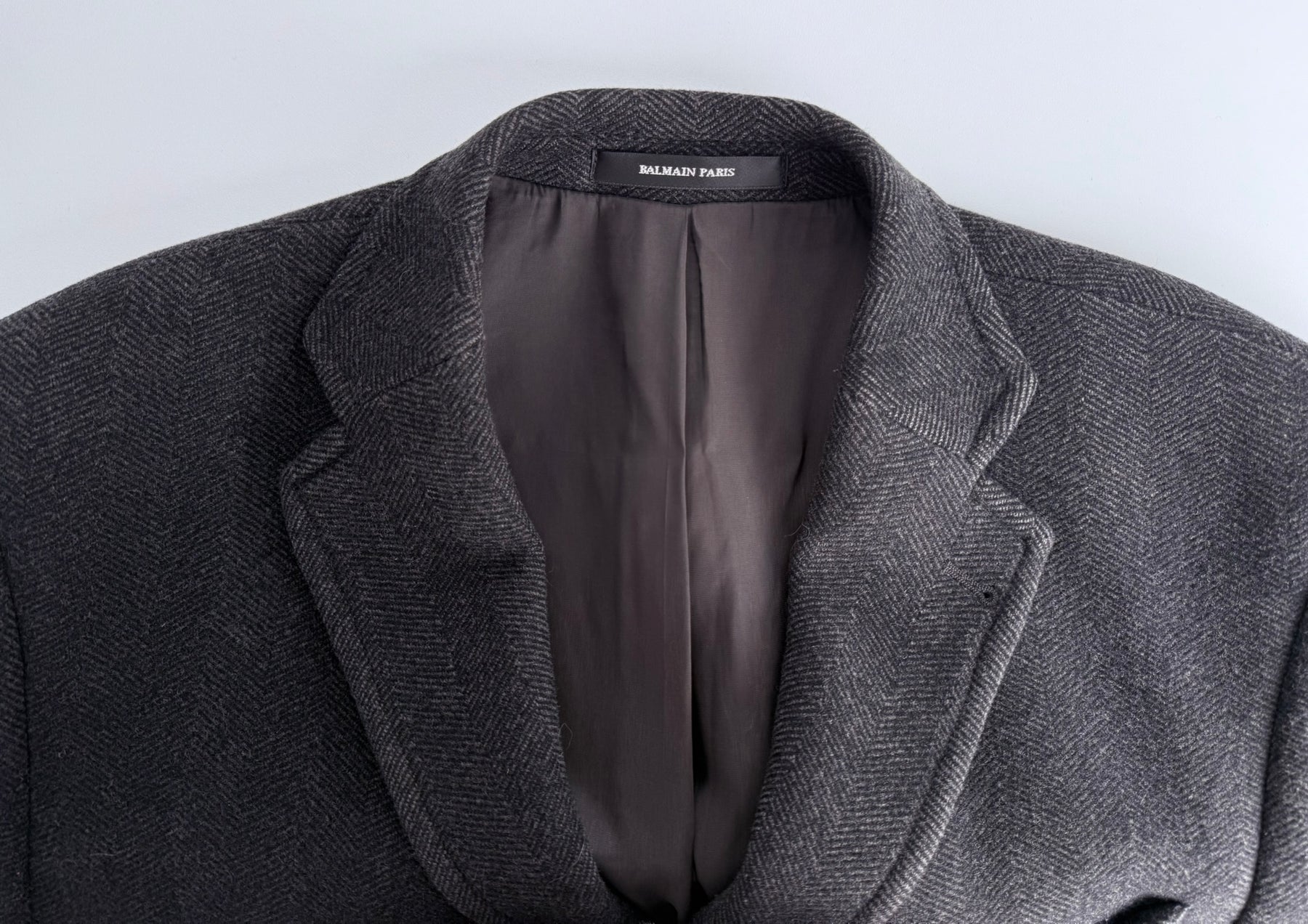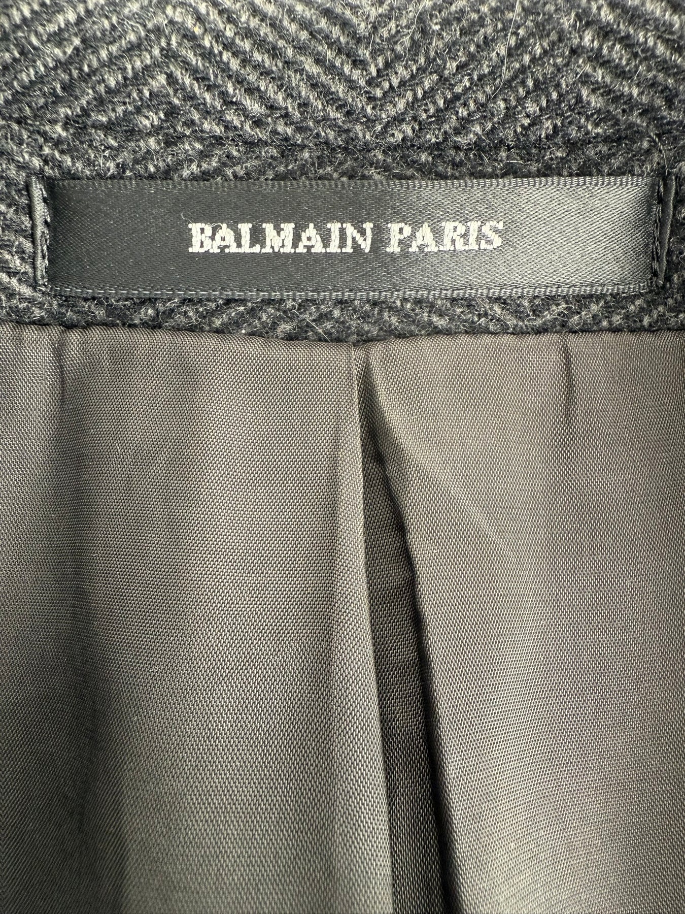 Abrigo largo de lana Balmain color gris oscuro talla (L) en perfecto estado (prácticamente nuevo con poco uso). Gran calidad de lana y poliamida con forro interior de poliéster y viscosa, con todos los botones originales.