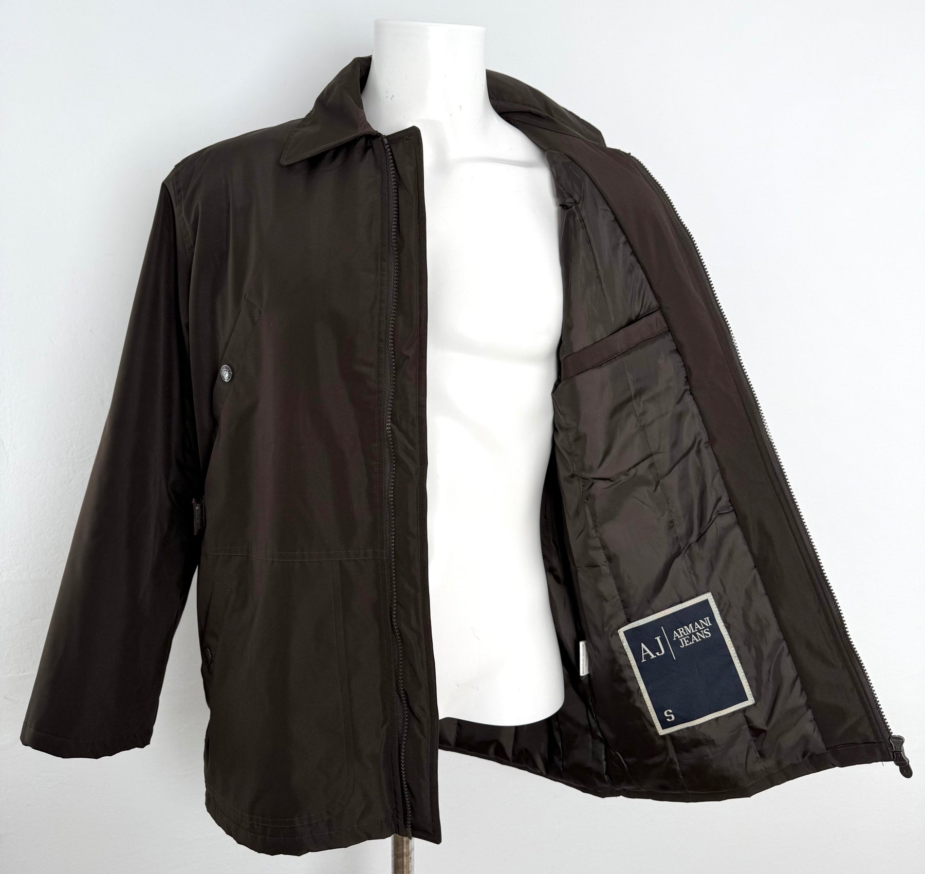 Abrigo Armani Jeans color marrón talla S en perfecto estado (prácticamente nuevo con poco uso). Gran calidad de poliéster con forro interior de nailon y relleno de poliéster, cuenta con todos los botones y cremalleras originales. Fecha de imágenes: 16/01/2026 Medidas (todas las medidas están en centímetros) A- Axila-axila: 56 B- Hombro-hombro: 50 C- Largo: 81 D- Largo de manga: 60 Lote: 6216