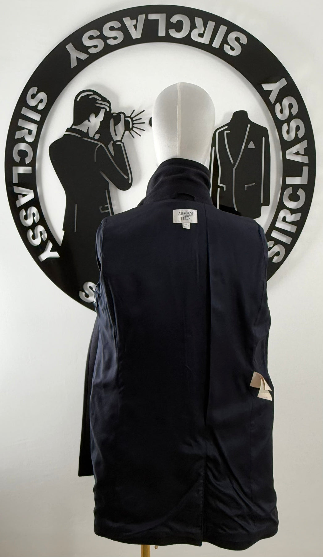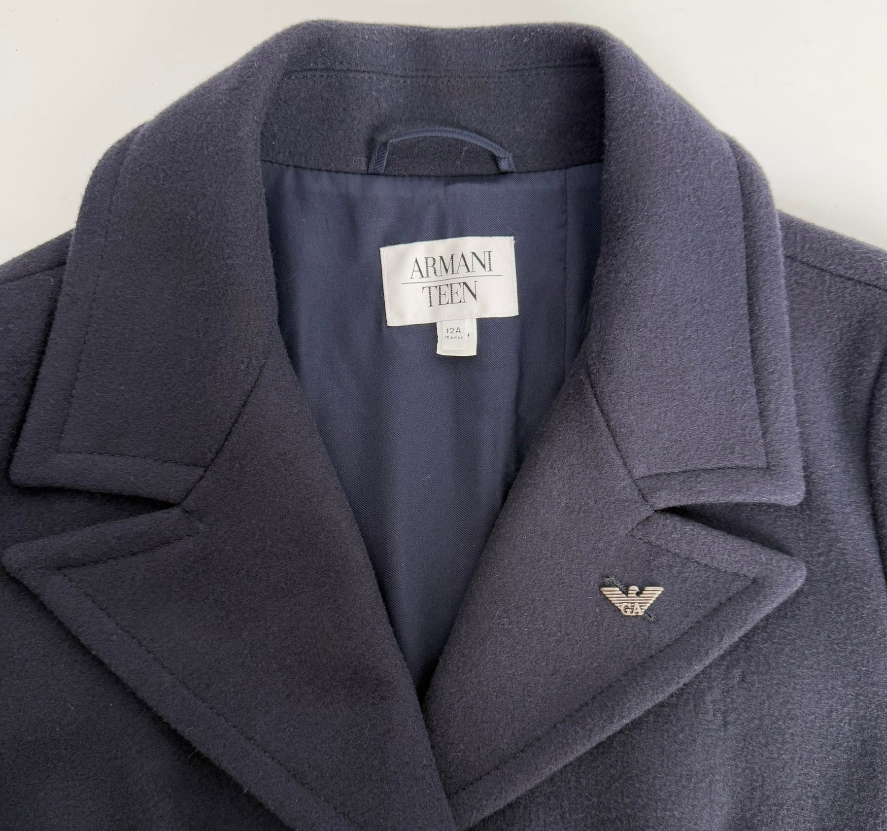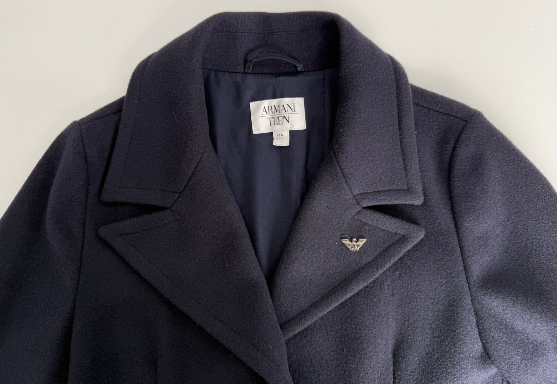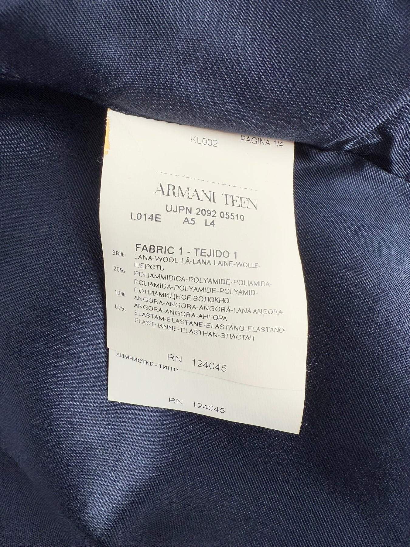 Abrigo de lana Armani Teen color azul oscuro talla 12 años (Equivalente a una S de mujer) en muy buen estado (pequeño roce en la lana de la parte frontal, poco visible). Gran calidad de lana, poliamida, angora y elastano con forro interior de acetato y poliamida, con todos los botones originales.