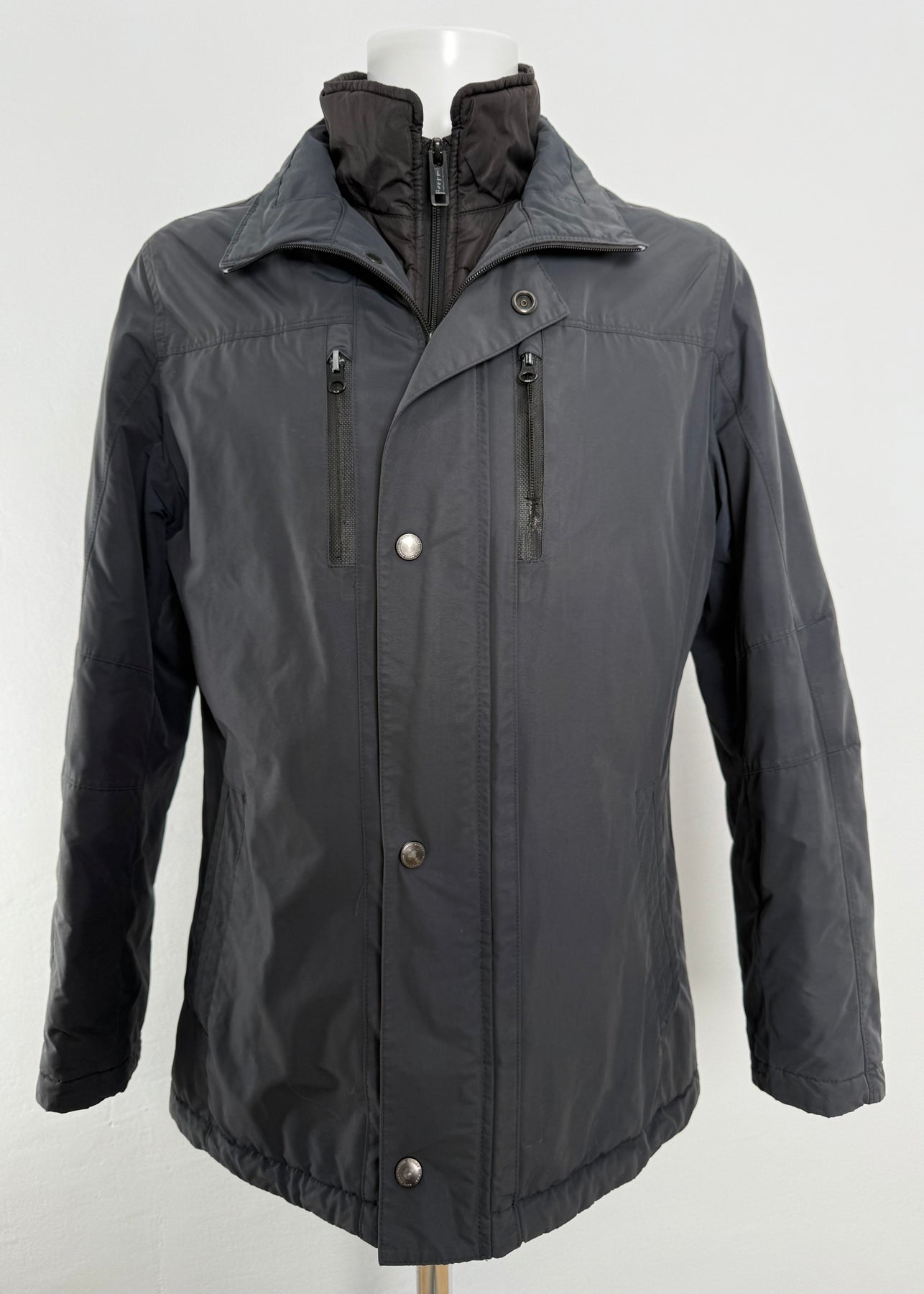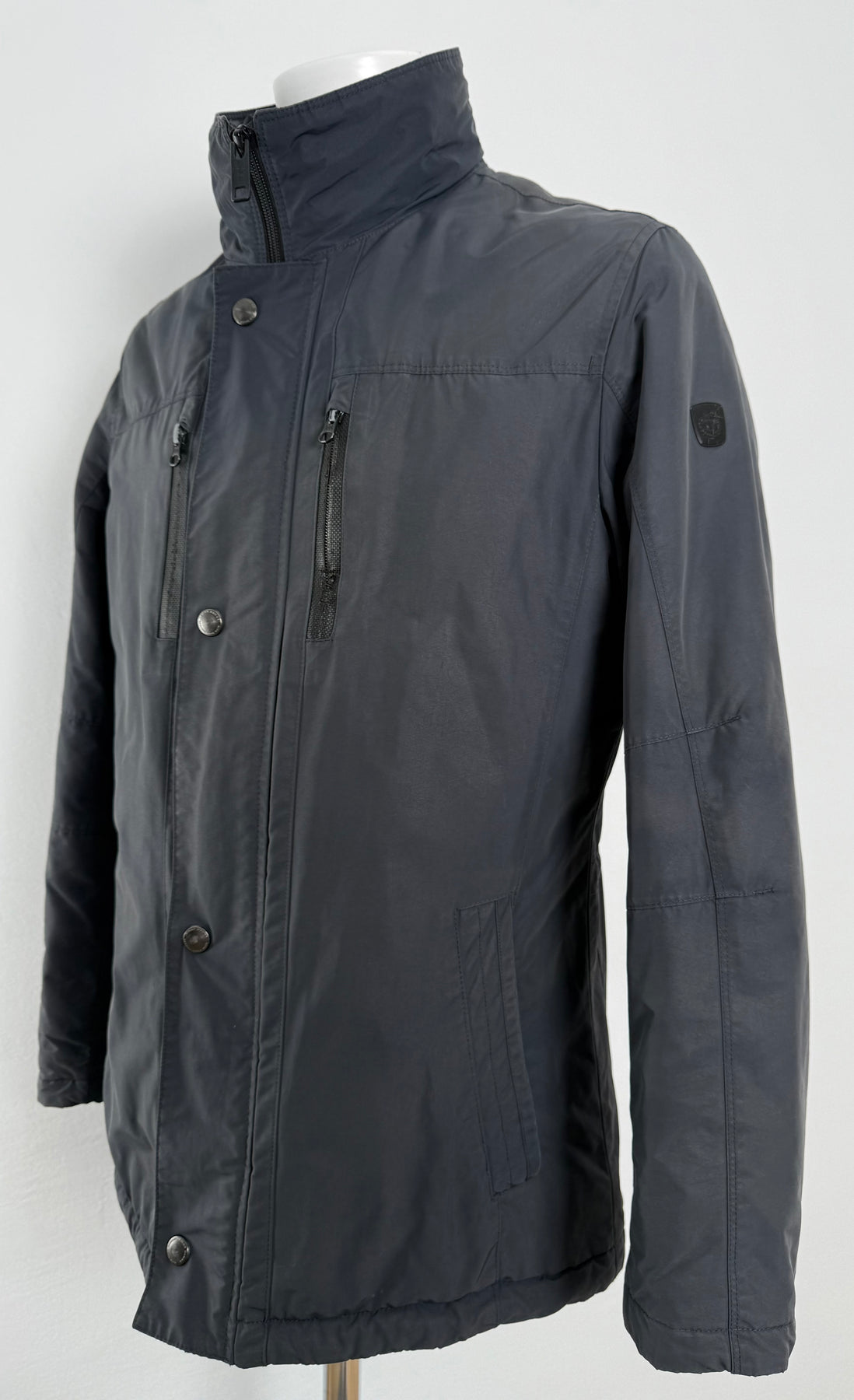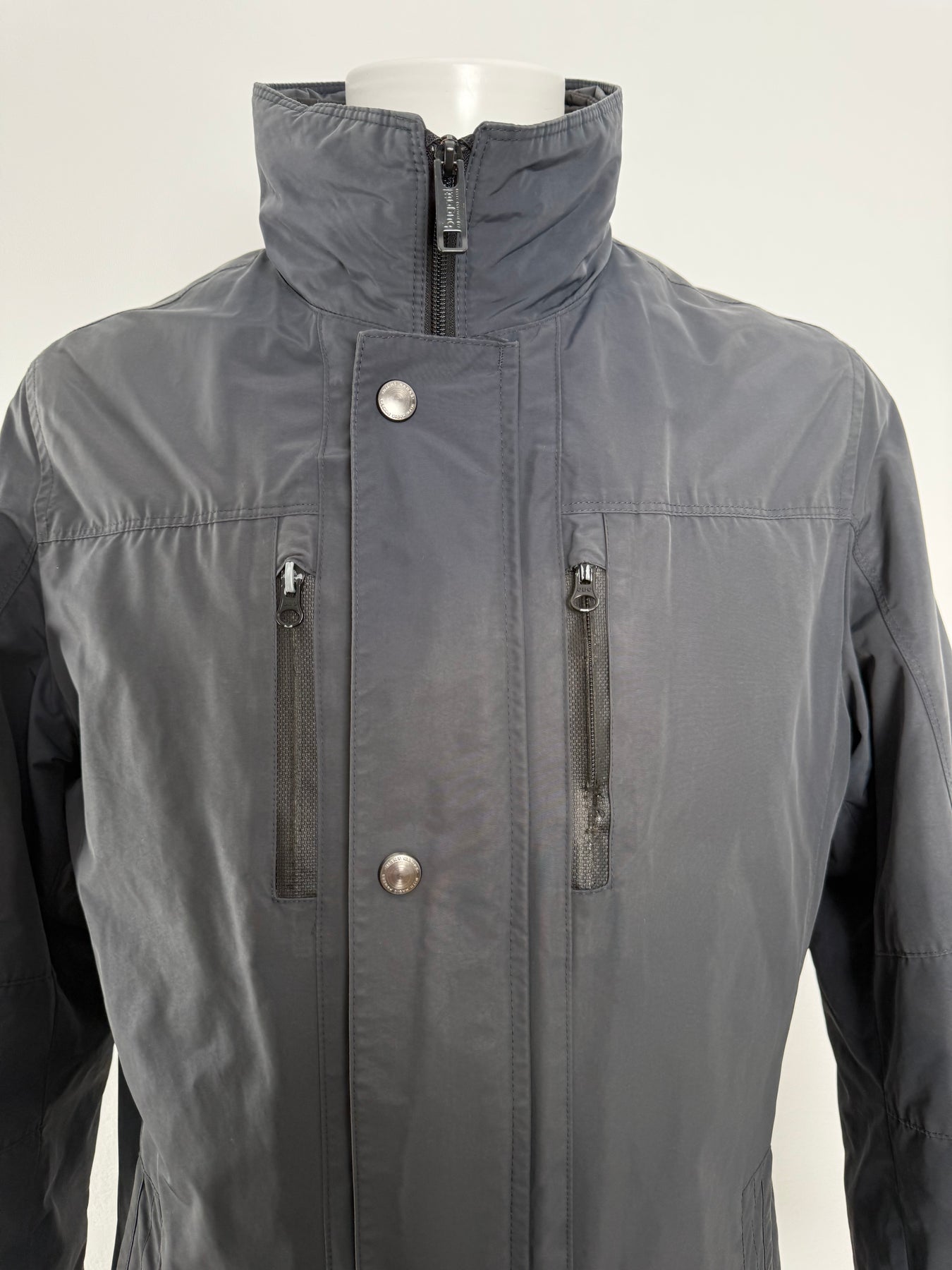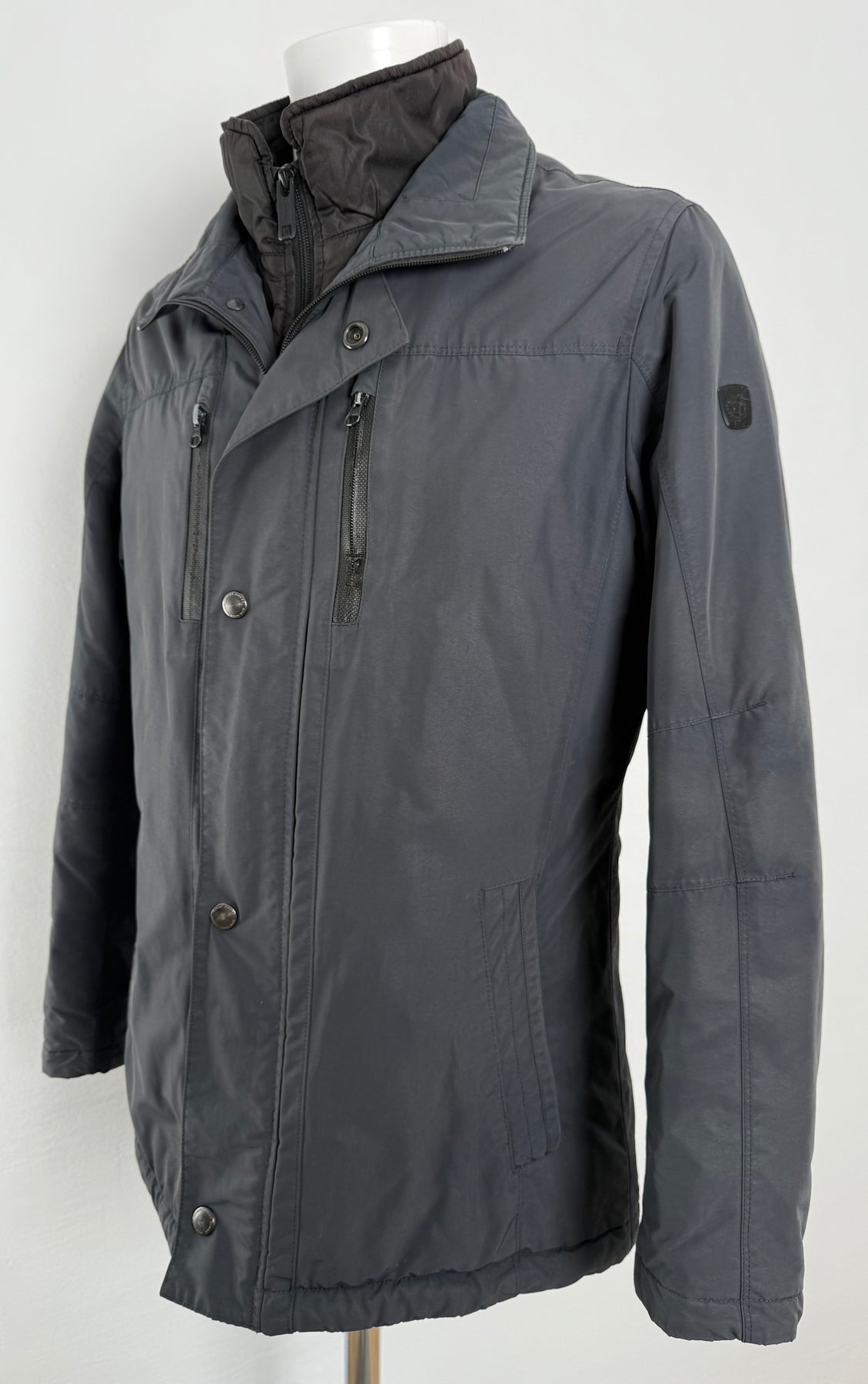 Abrigo Bugatti color azul oscuro talla 48 (M) en muy buen estado (tiene una cremallera de un bolsillo de la zona del pecho que no está en buen estado). Gran calidad de poliéster y poliamida con forro interior de poliéster, cuenta con todos los botones y cremalleras originales.