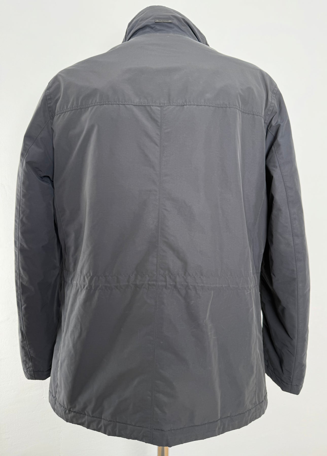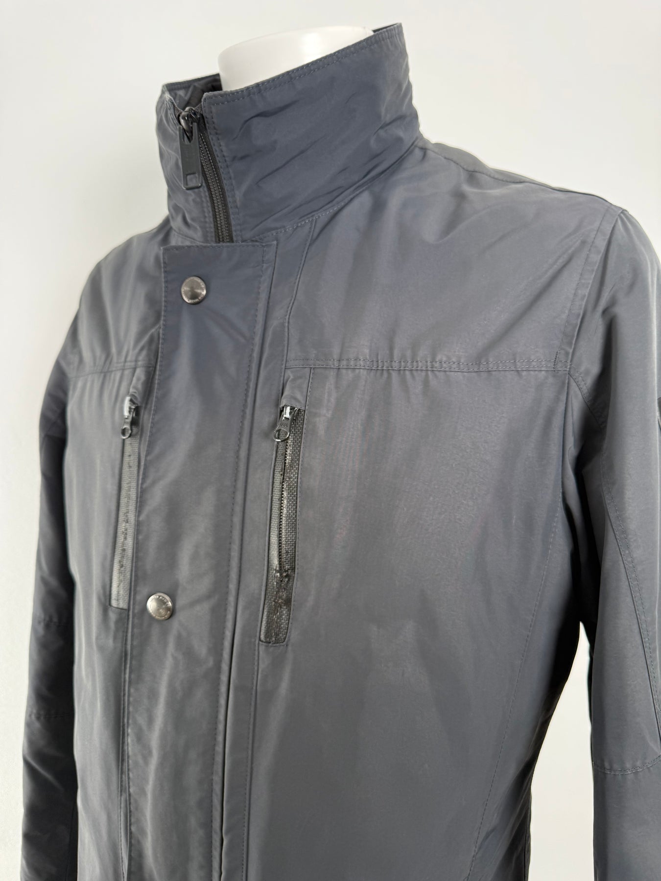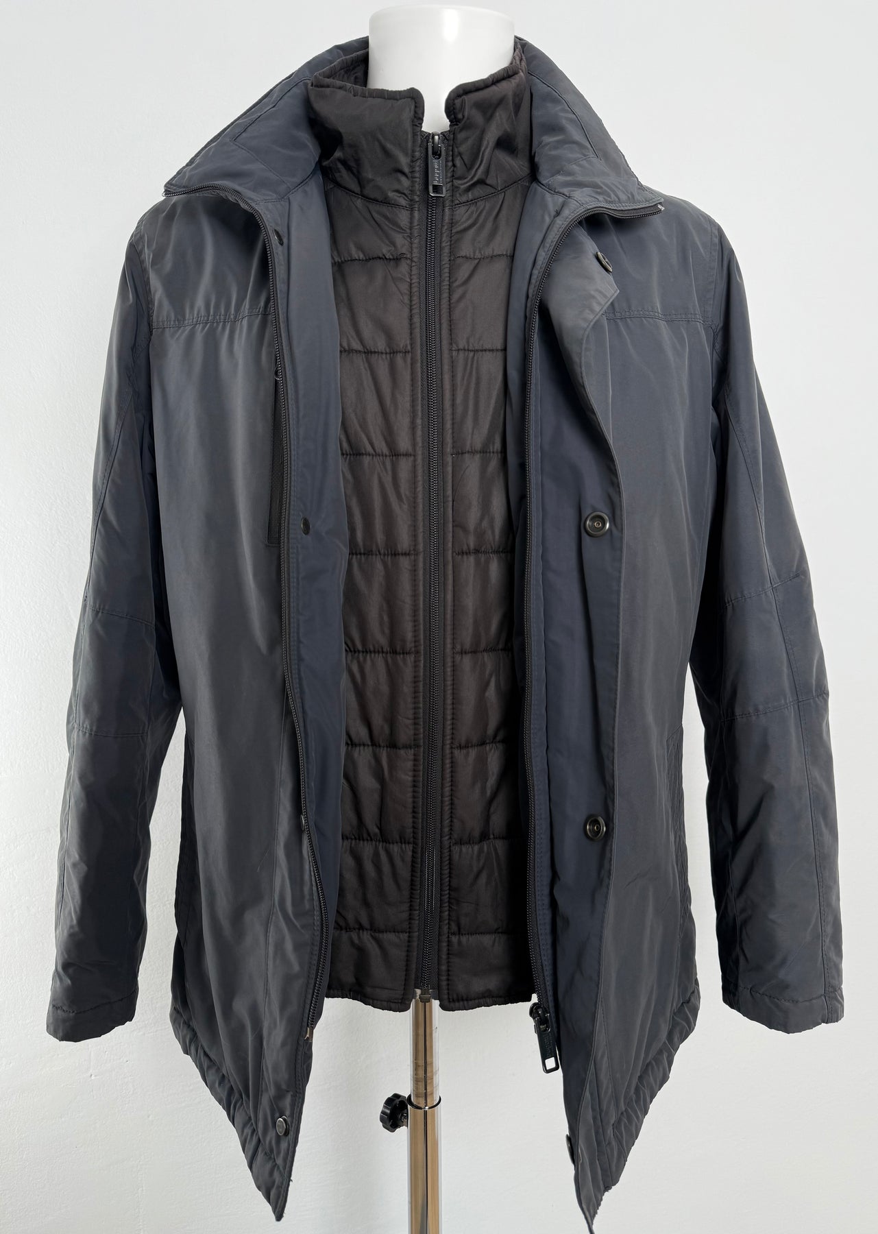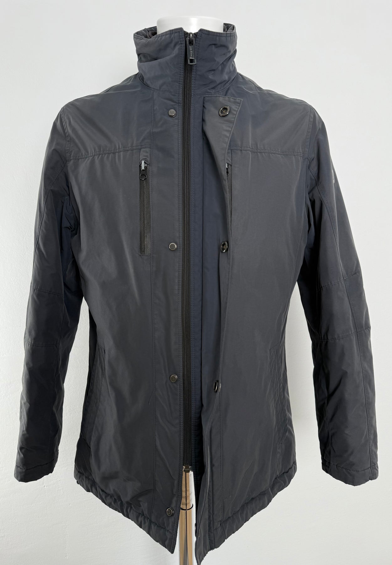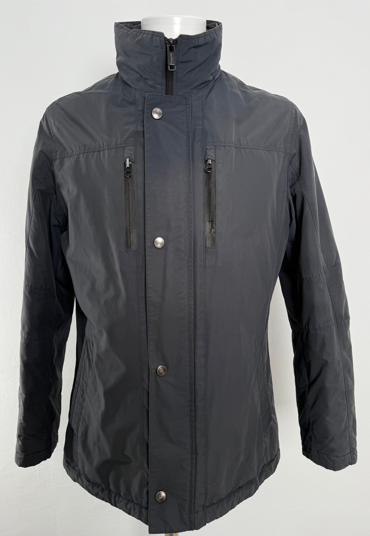 Abrigo Bugatti color azul oscuro talla 48 (M) en muy buen estado (tiene una cremallera de un bolsillo de la zona del pecho que no está en buen estado). Gran calidad de poliéster y poliamida con forro interior de poliéster, cuenta con todos los botones y cremalleras originales.