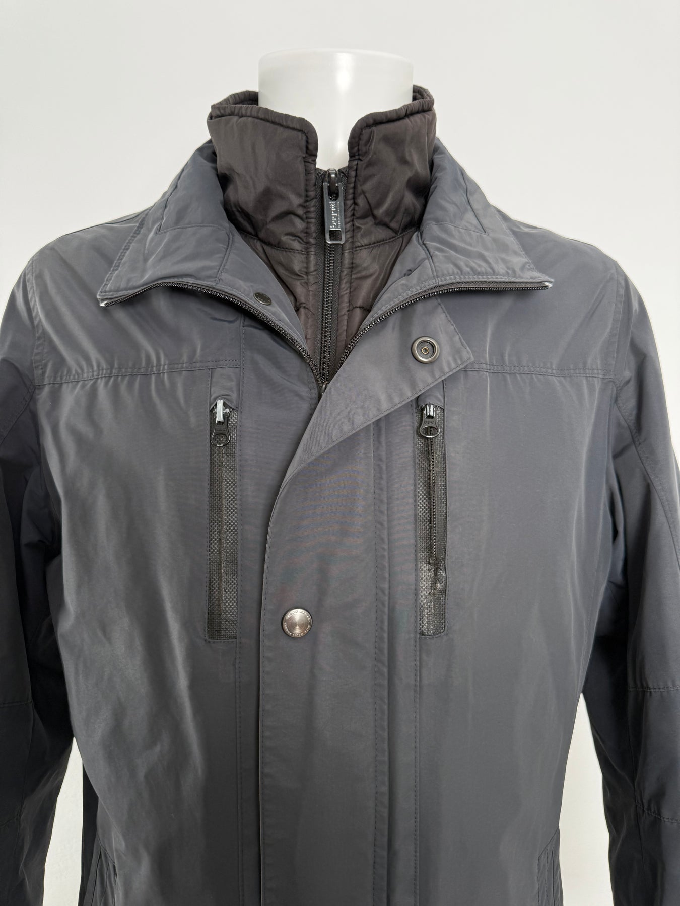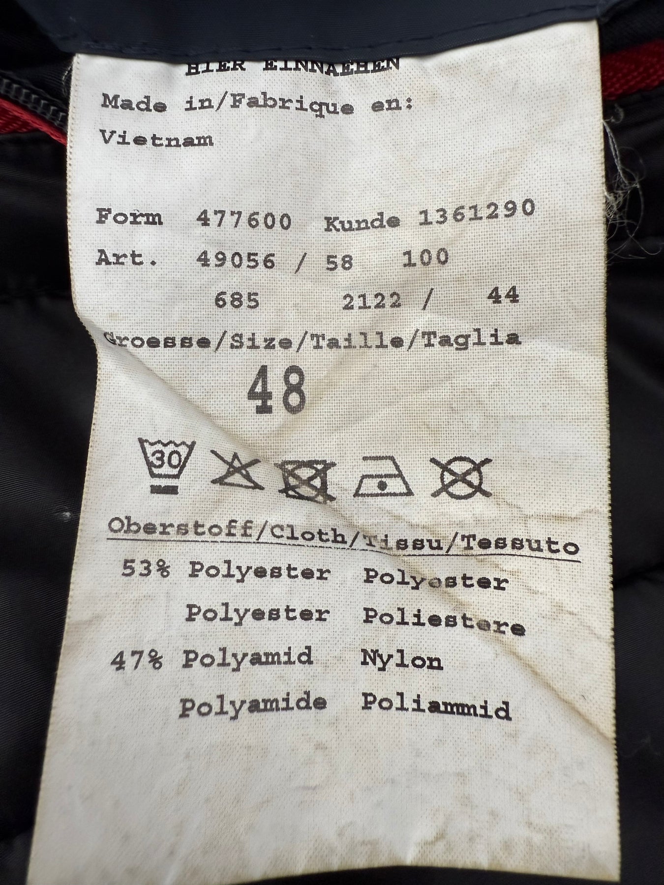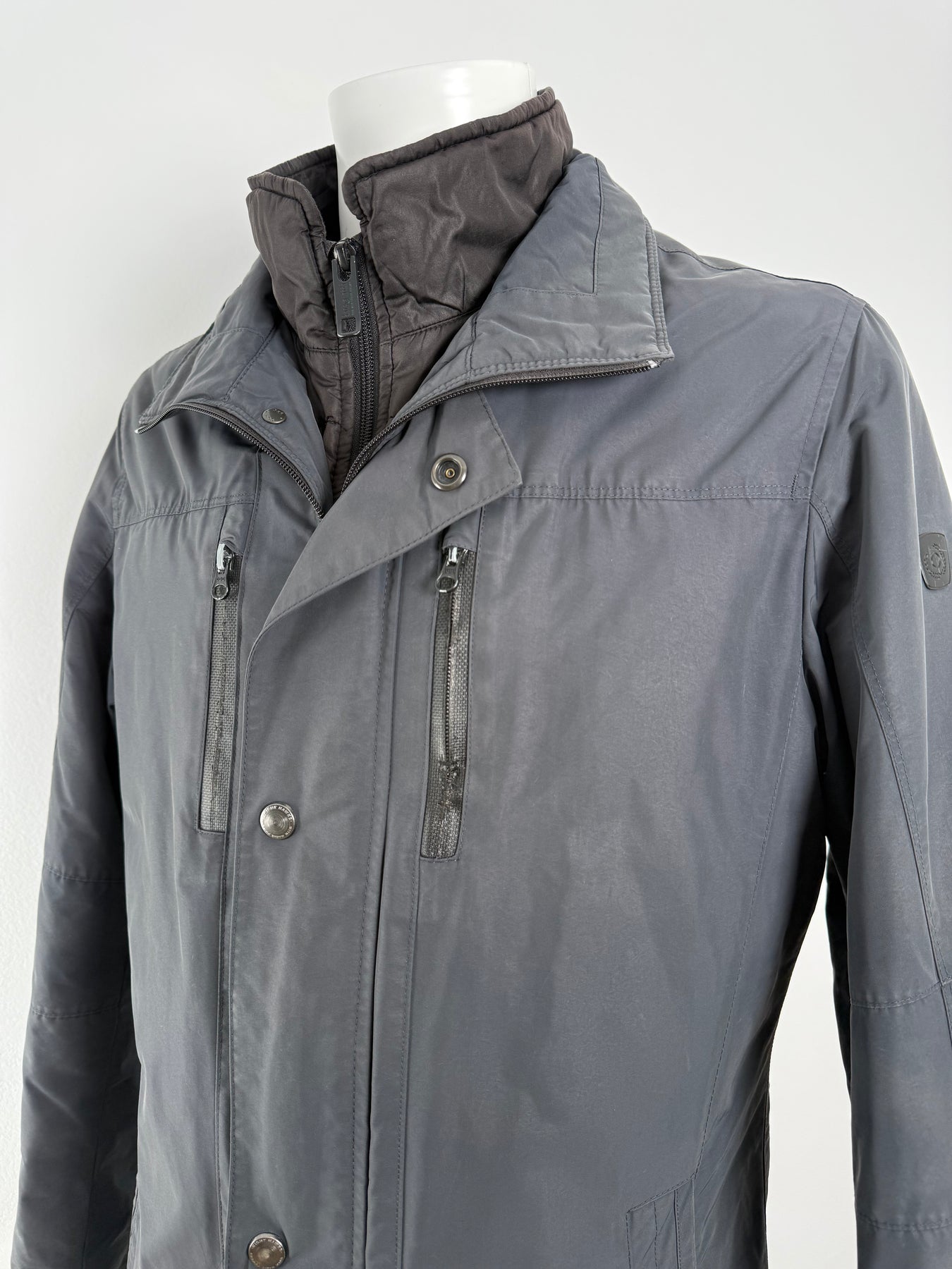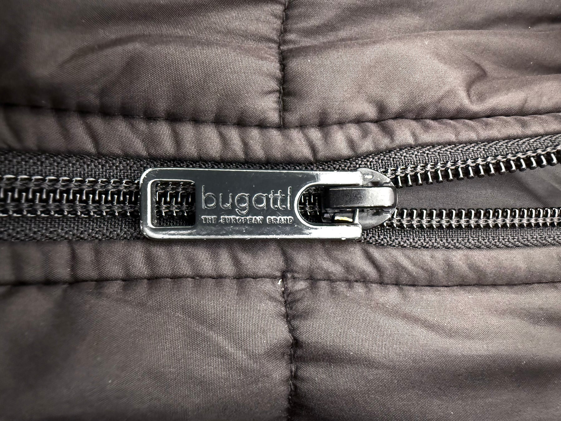 Abrigo Bugatti color azul oscuro talla 48 (M) en muy buen estado (tiene una cremallera de un bolsillo de la zona del pecho que no está en buen estado). Gran calidad de poliéster y poliamida con forro interior de poliéster, cuenta con todos los botones y cremalleras originales.