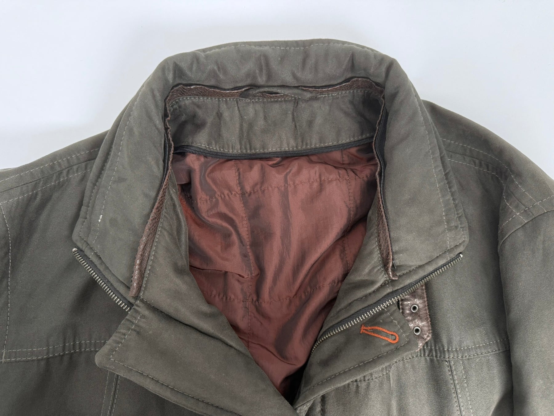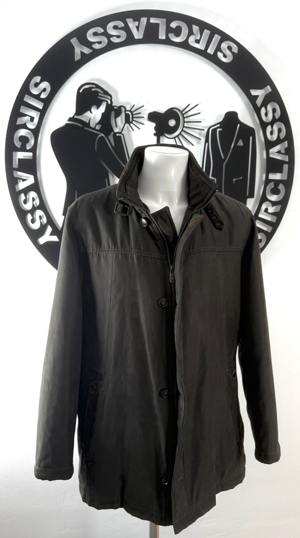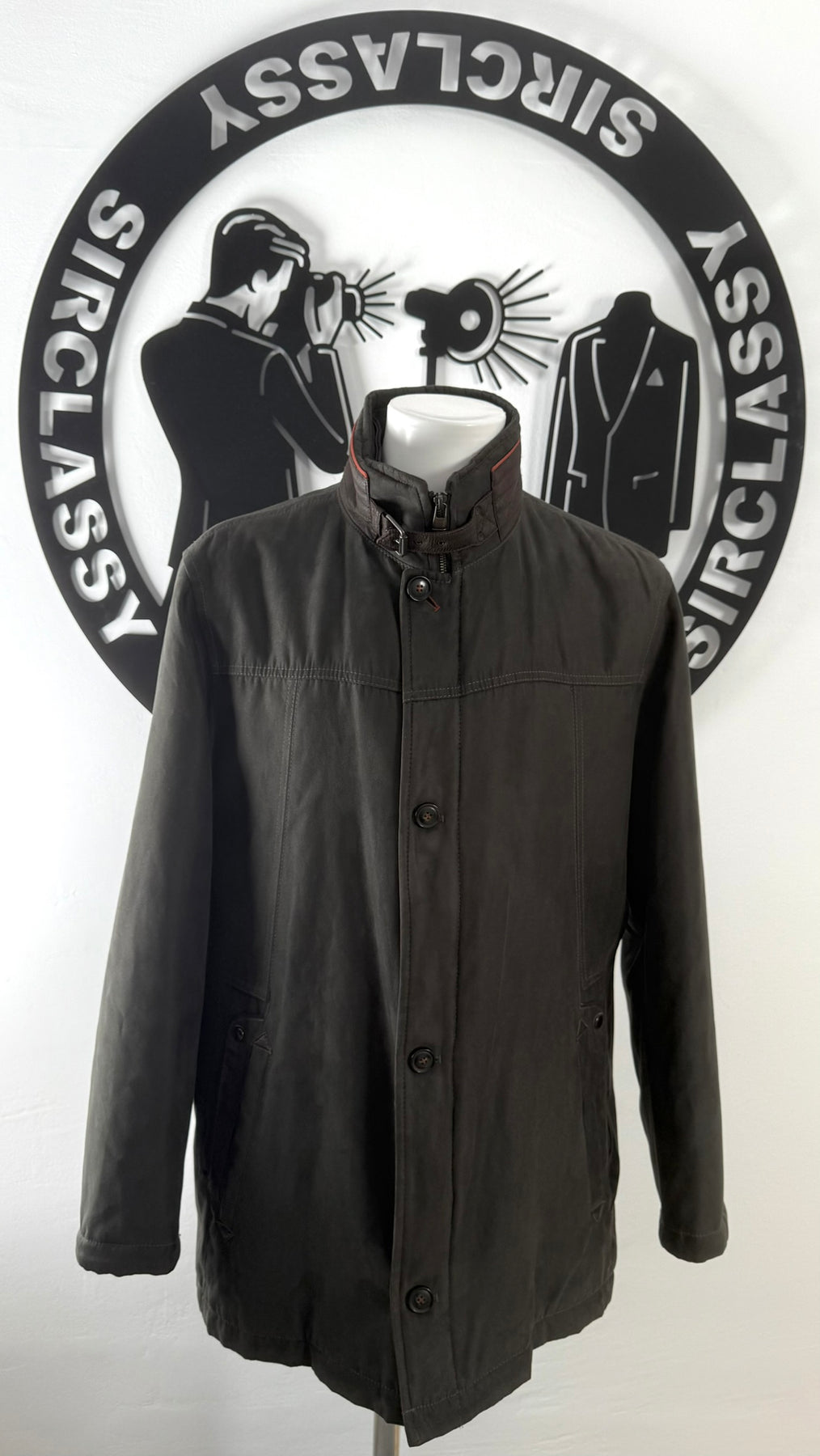 Abrigo Bugatti color caqui talla 54 (XL) en muy buen estado (pequeñas marcas de uso poco visibles). Gran calidad de poliéster con forro interior de poliamida y poliéster, cuenta con todos los botones y cremalleras originales.