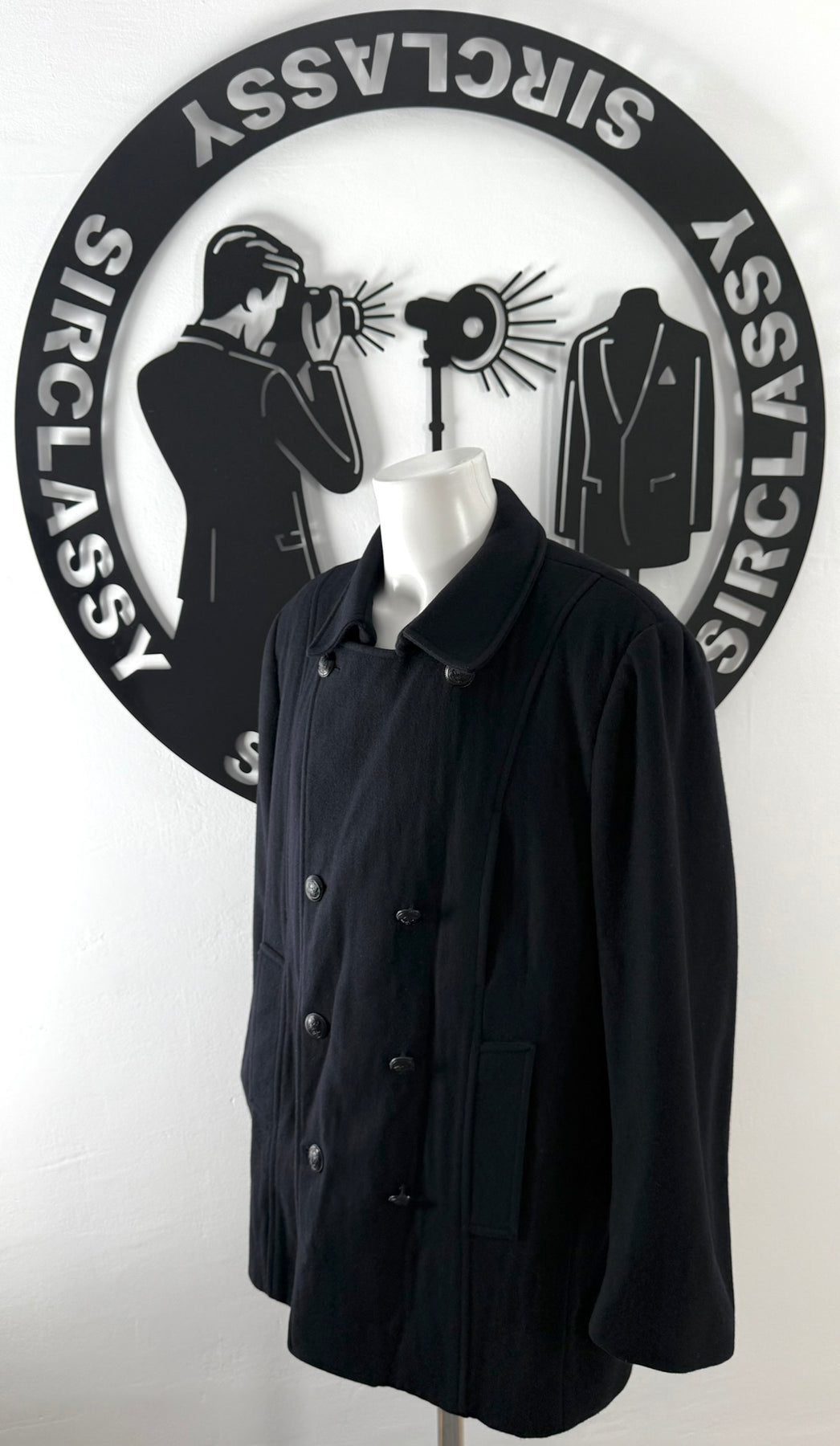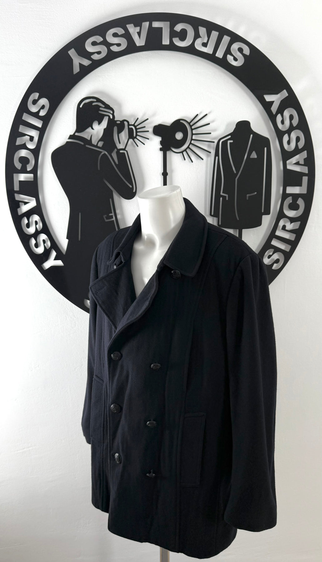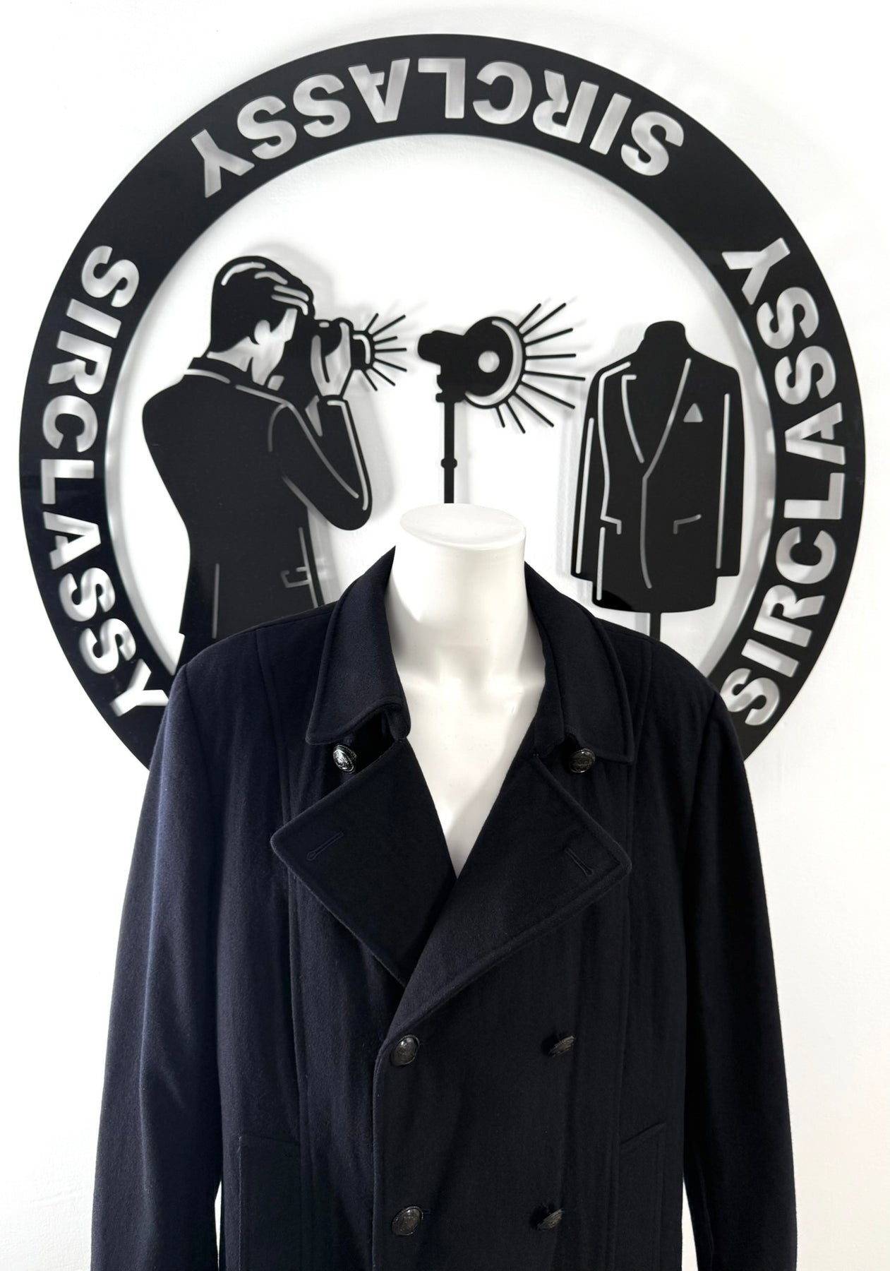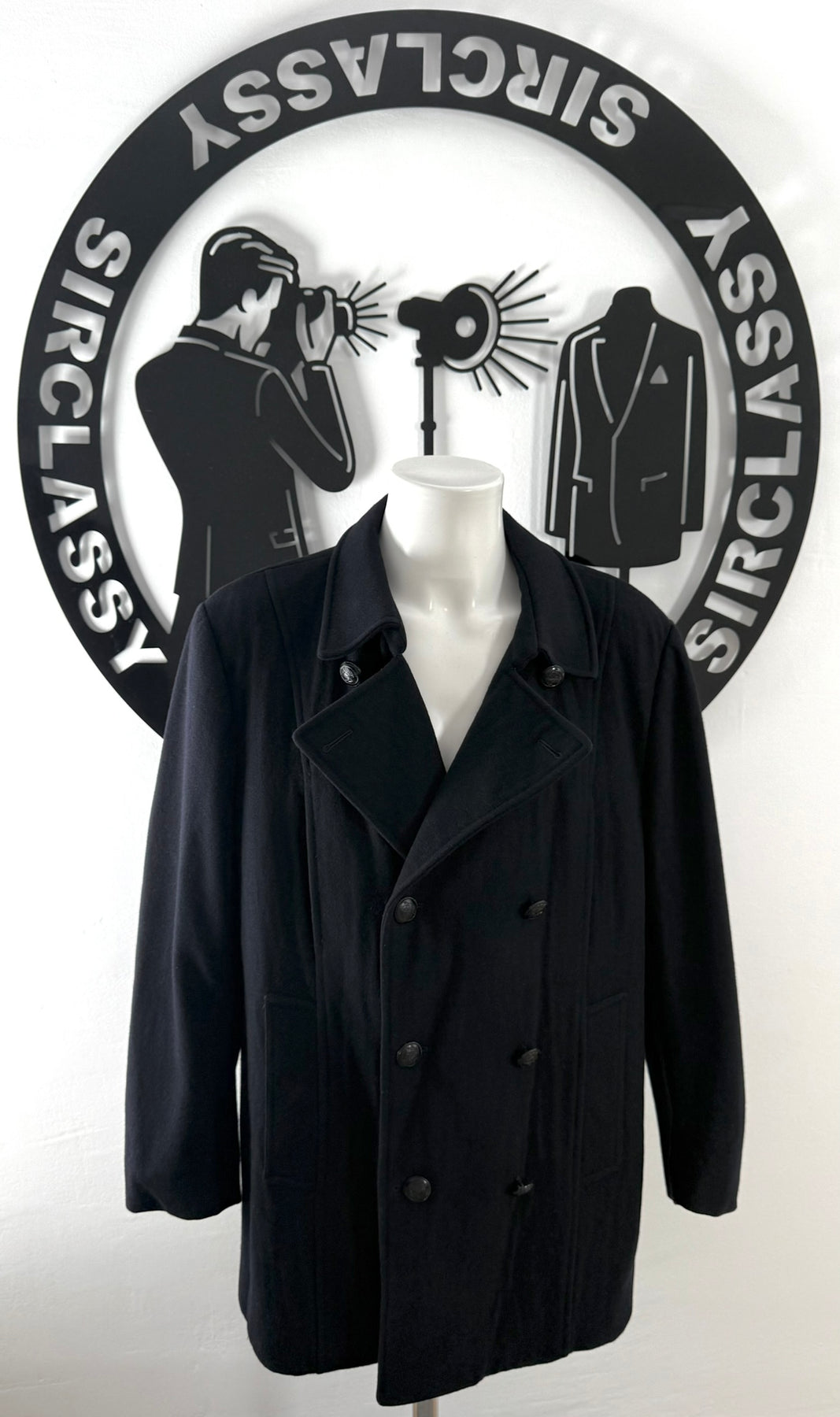 Abrigo de lana Burberrys color azul oscuro talla 52 (L) en perfecto estado (prácticamente nuevo con solo desgaste la etiqueta de composición). Gran calidad de lana y poliamida con forro interior de poliéster y viscosa, con todos los botones originales.