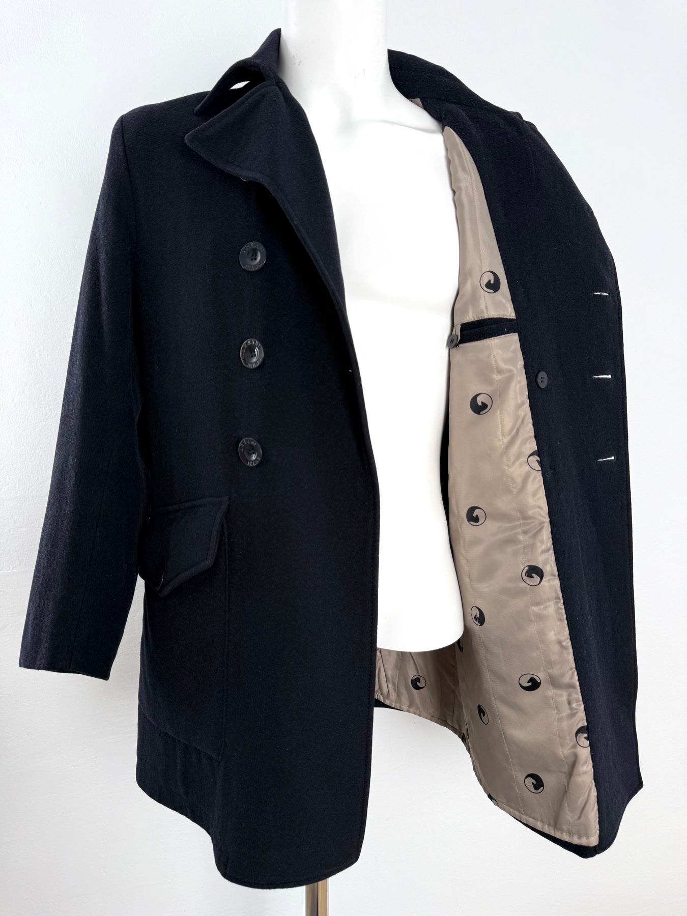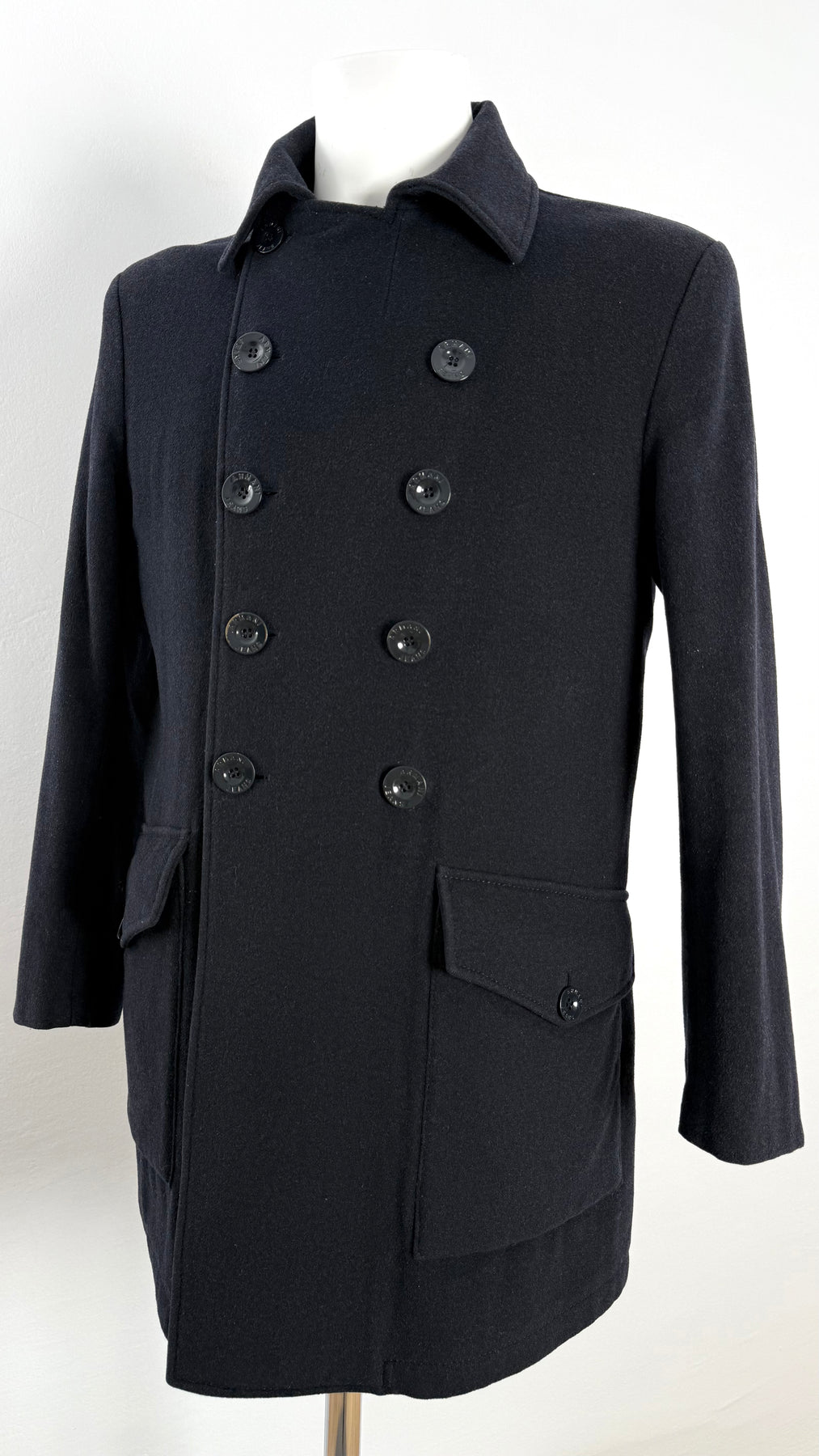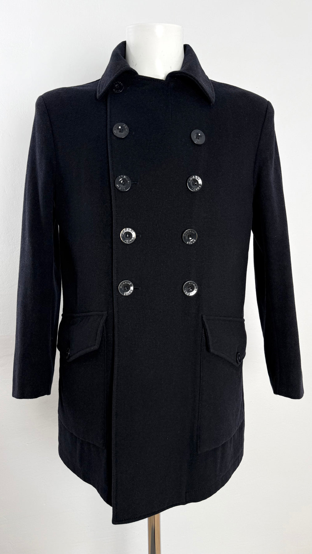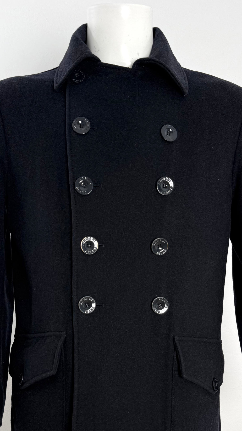 Abrigo Armani Jeans color azul oscuro talla 48 (S) en perfecto estado (prácticamente nuevo con poco uso). Gran calidad de lana, poliéster, viscosa, poliamida y acrílico con forro interior y relleno de poliester, cuenta con todos los botones originales.