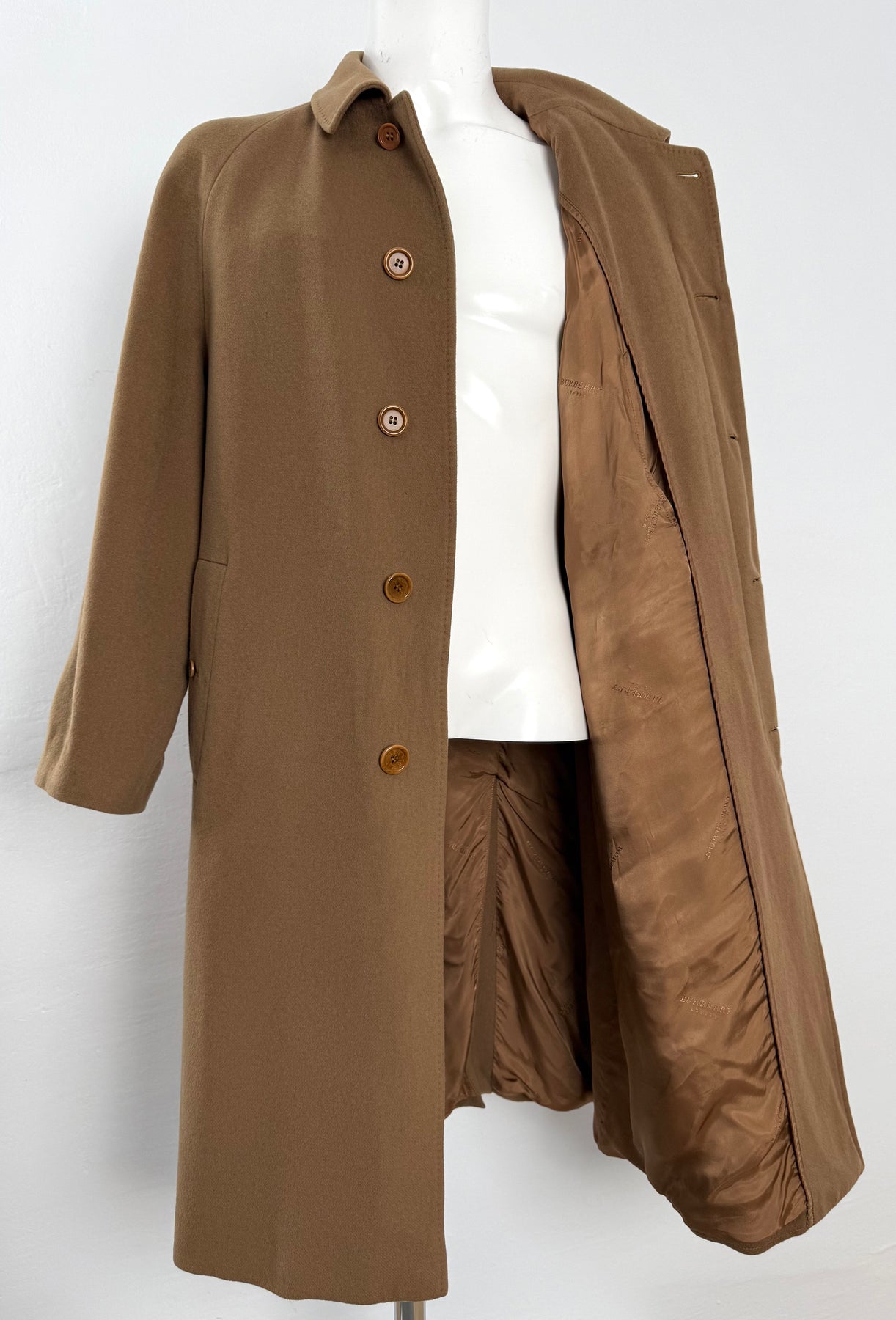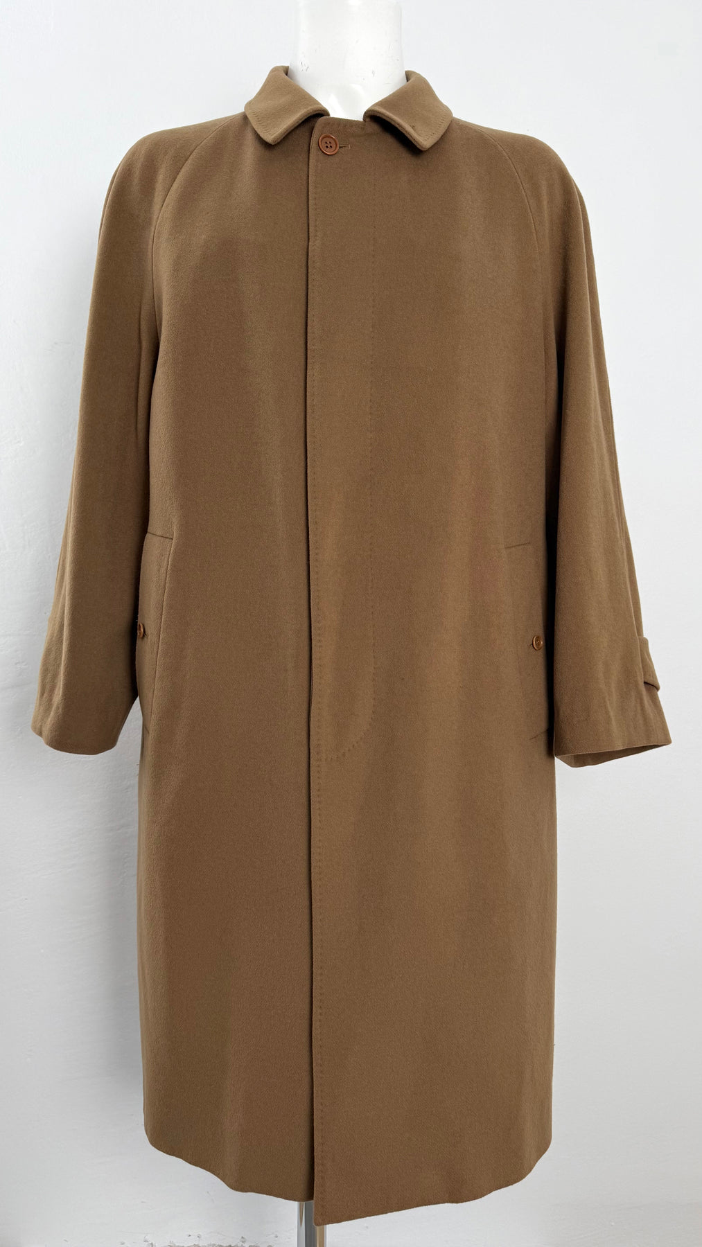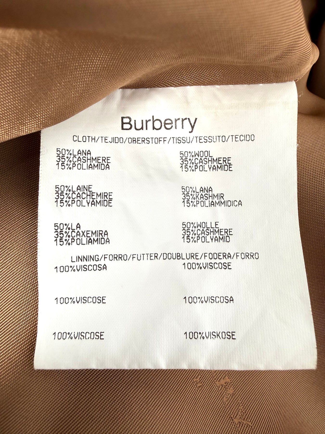 Abrigo de lana Burberry color marrón/camel talla 54 (L) en muy buen estado (con pequeños roces en la lana en la zona frontal). Gran calidad de lana, cachemir y poliamida con forro interior de viscosa, cuenta con todos los botones originales.