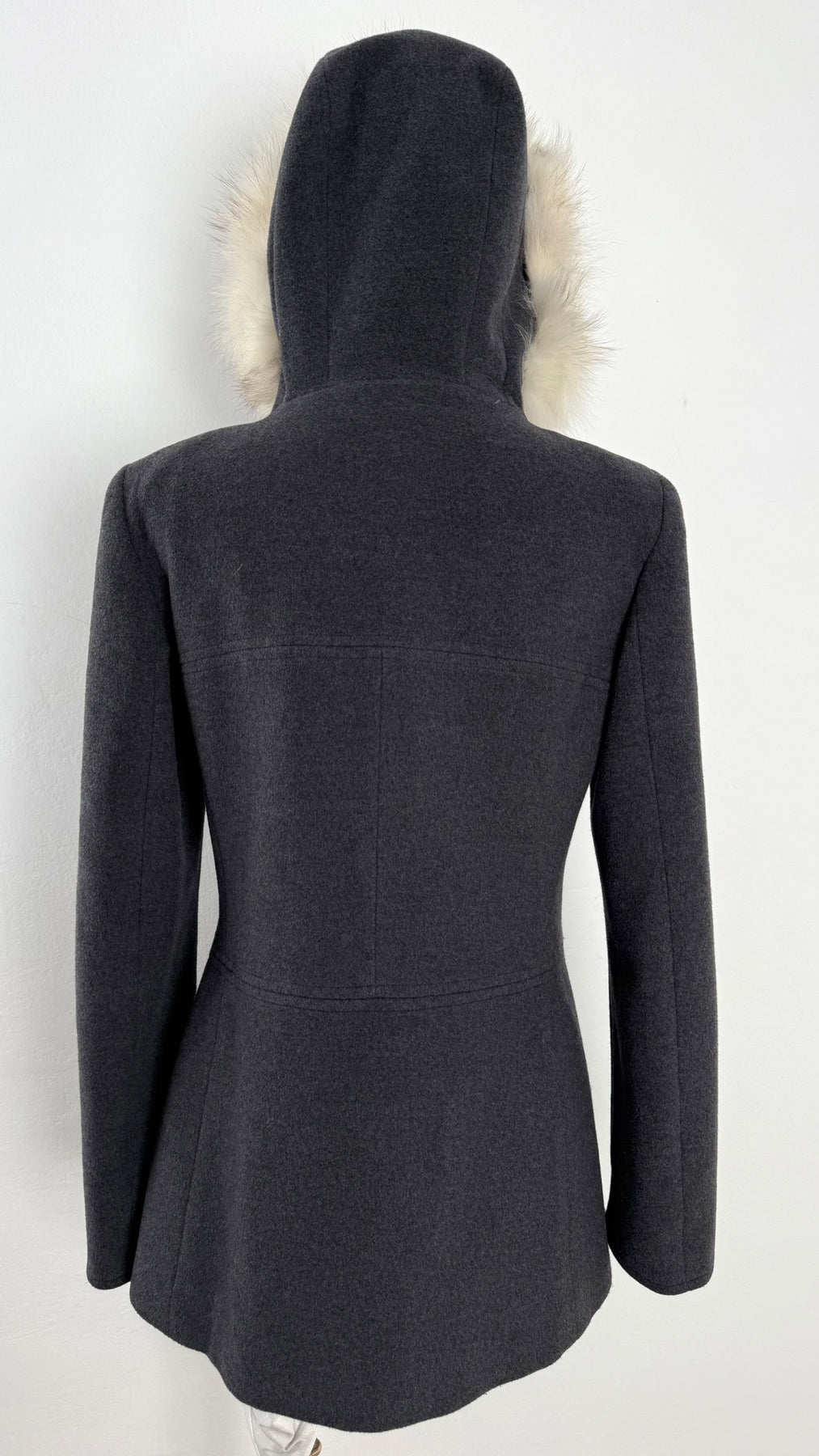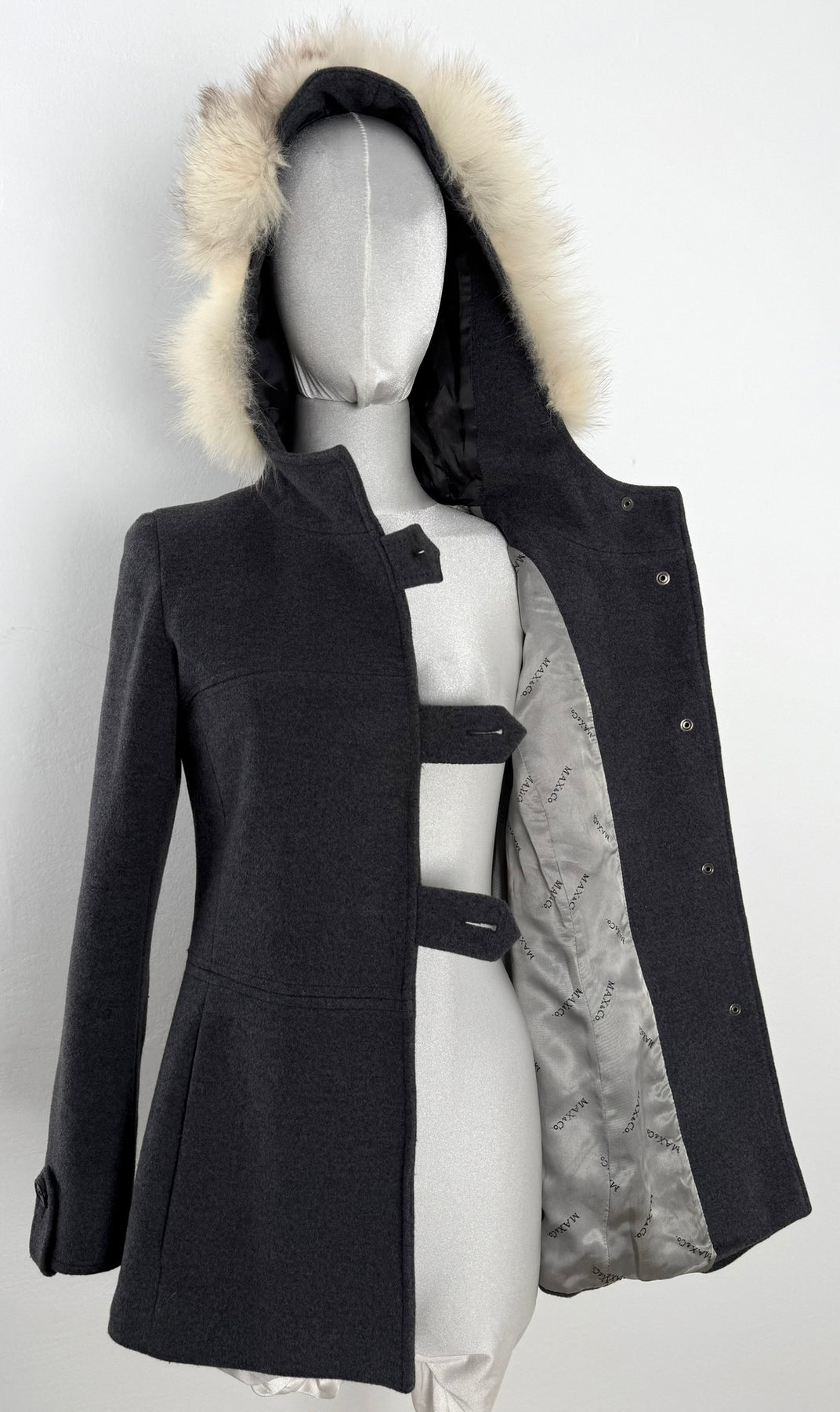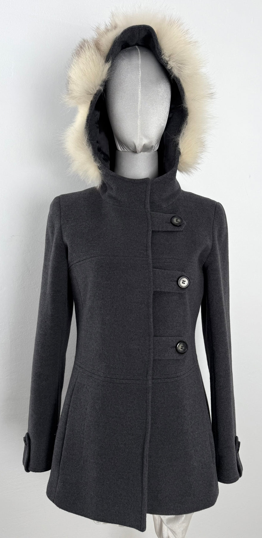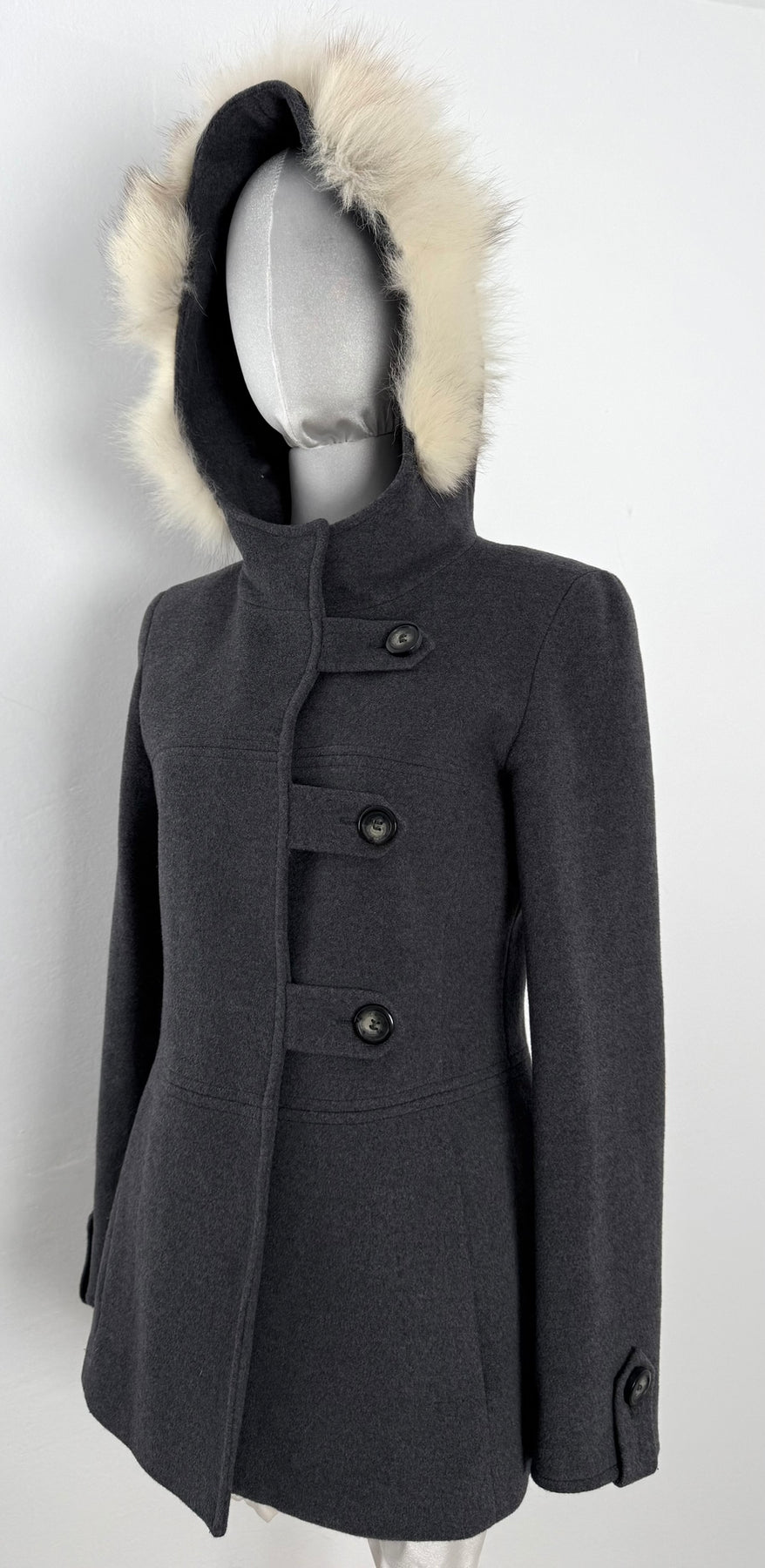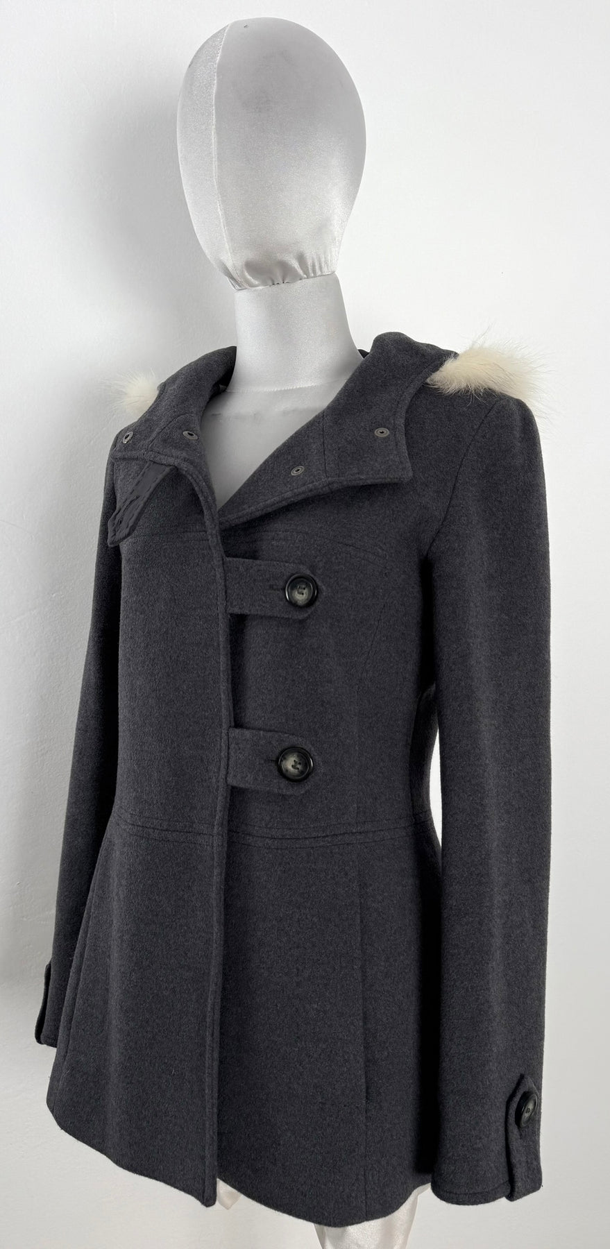 Abrigo Max & Co color gris talla (S) en muy buen estado (con poco uso, sin etiqueta de composición, zonas en el pelo de la capucha más corto). Gran calidad de lana con forro interior de poliamida y pelo en la capucha, cuenta con todos los botones originales.