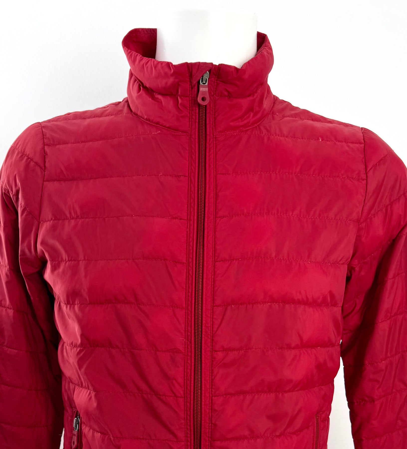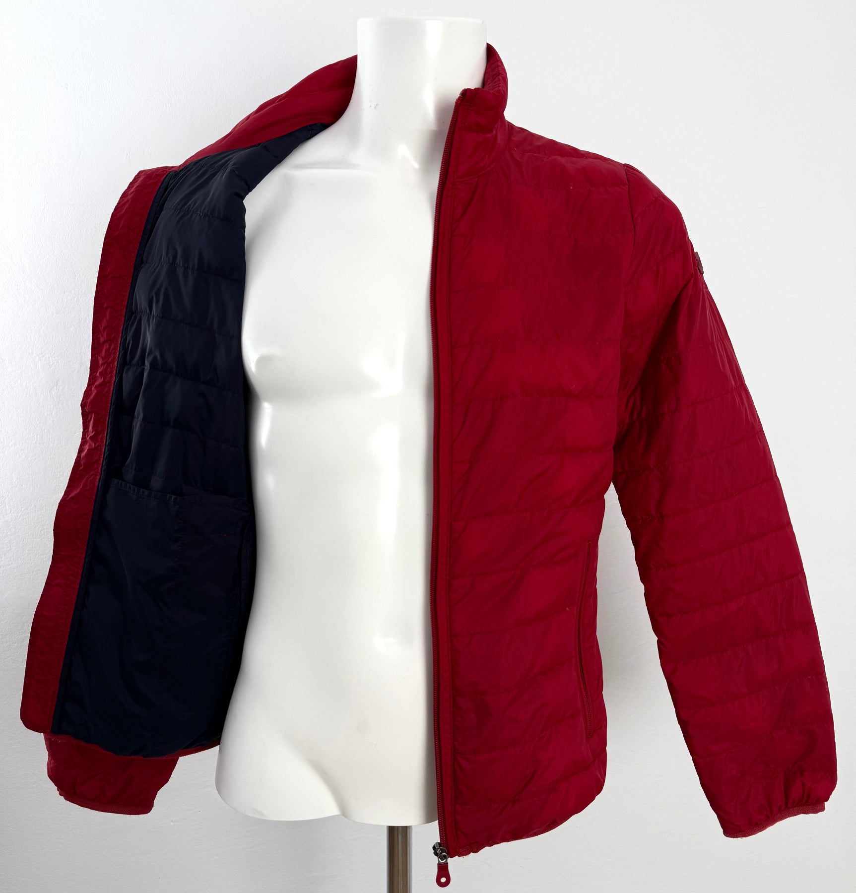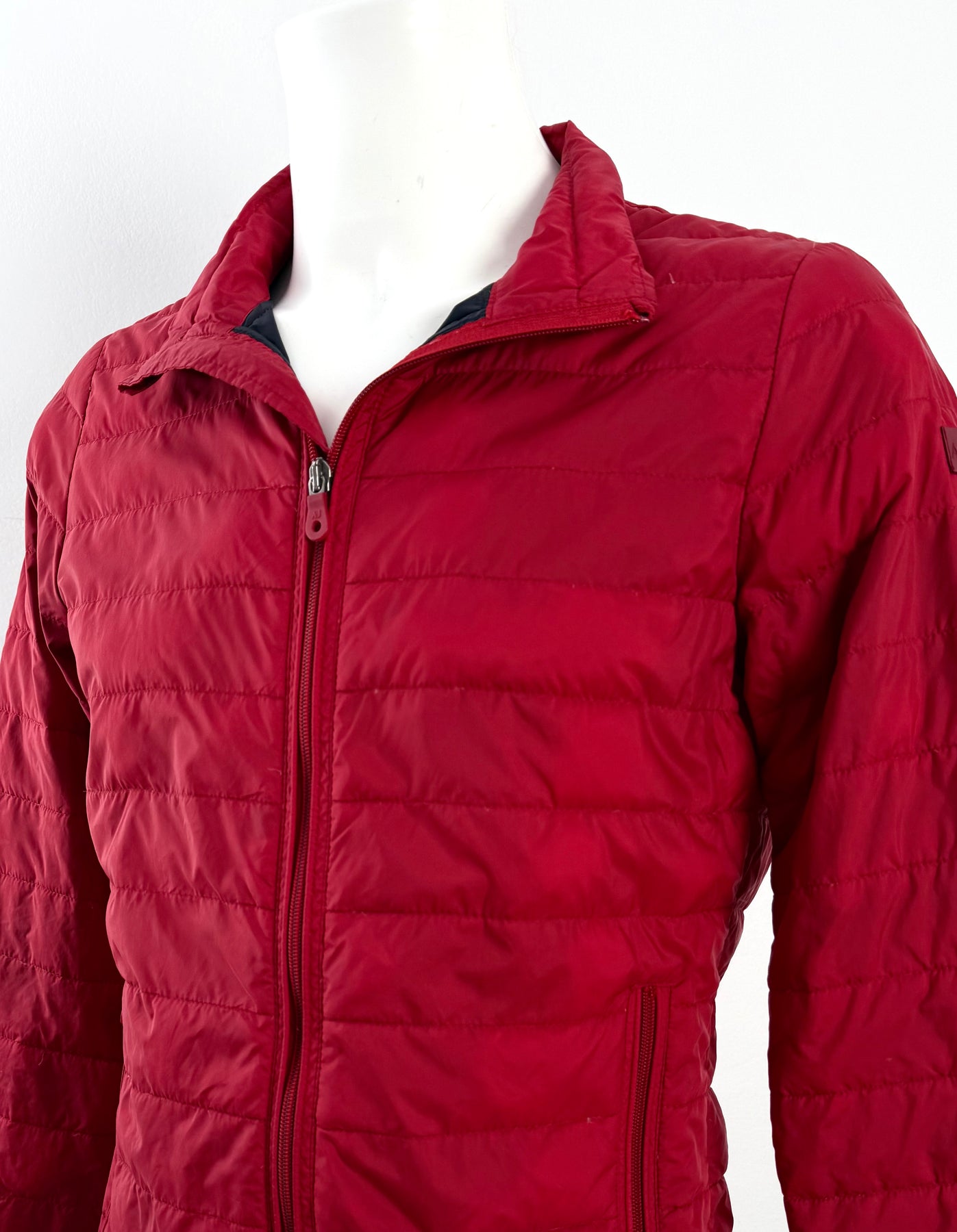 Abrigo de plumas Armani Jeans color rojo talla 46 (XS) en muy buen estado (con poco uso, pequeñas manchas azules poco visibles). Gran calidad de poliamida con relleno de plumas, cuenta con todas las cremalleras originales.