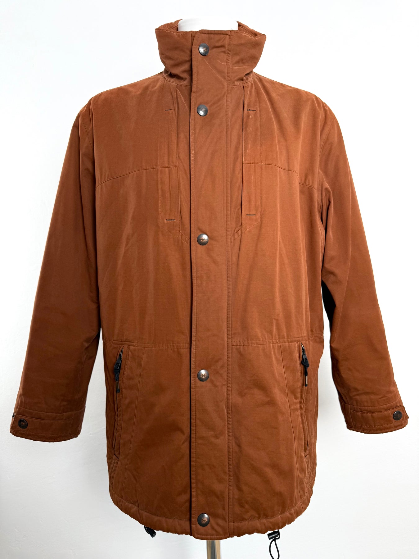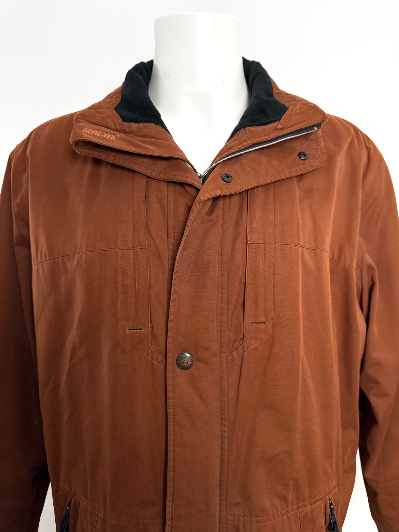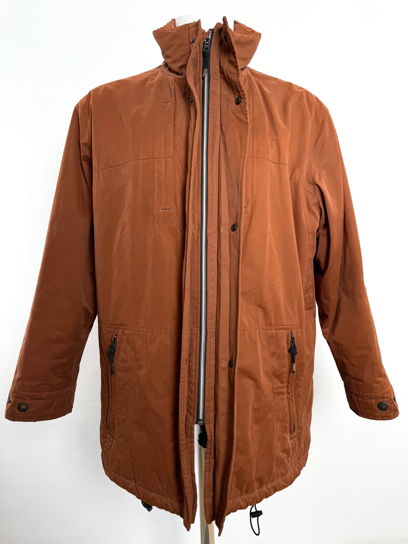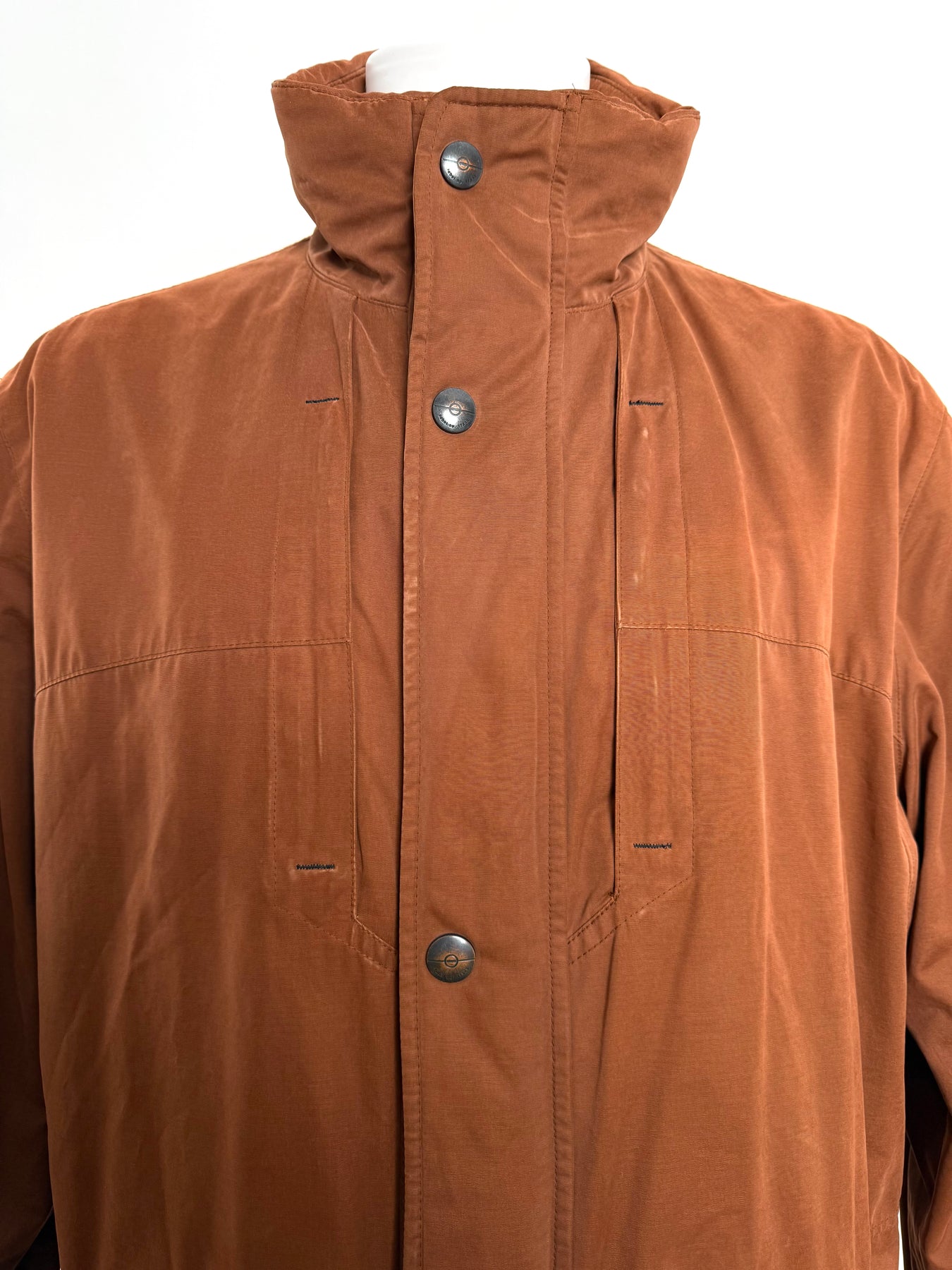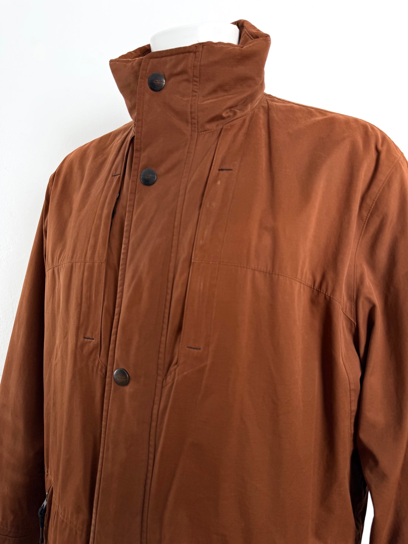 Abrigo con tecnología Goretex Bugatti color marrón talla 50 (L)en muy buen estado (pequeñas marcas de uso como se ve en las imágenes). Gran calidad de algodón, poliéster y poliamida con forro interior de poliéster, cuenta con todos los botones y cremalleras originales.