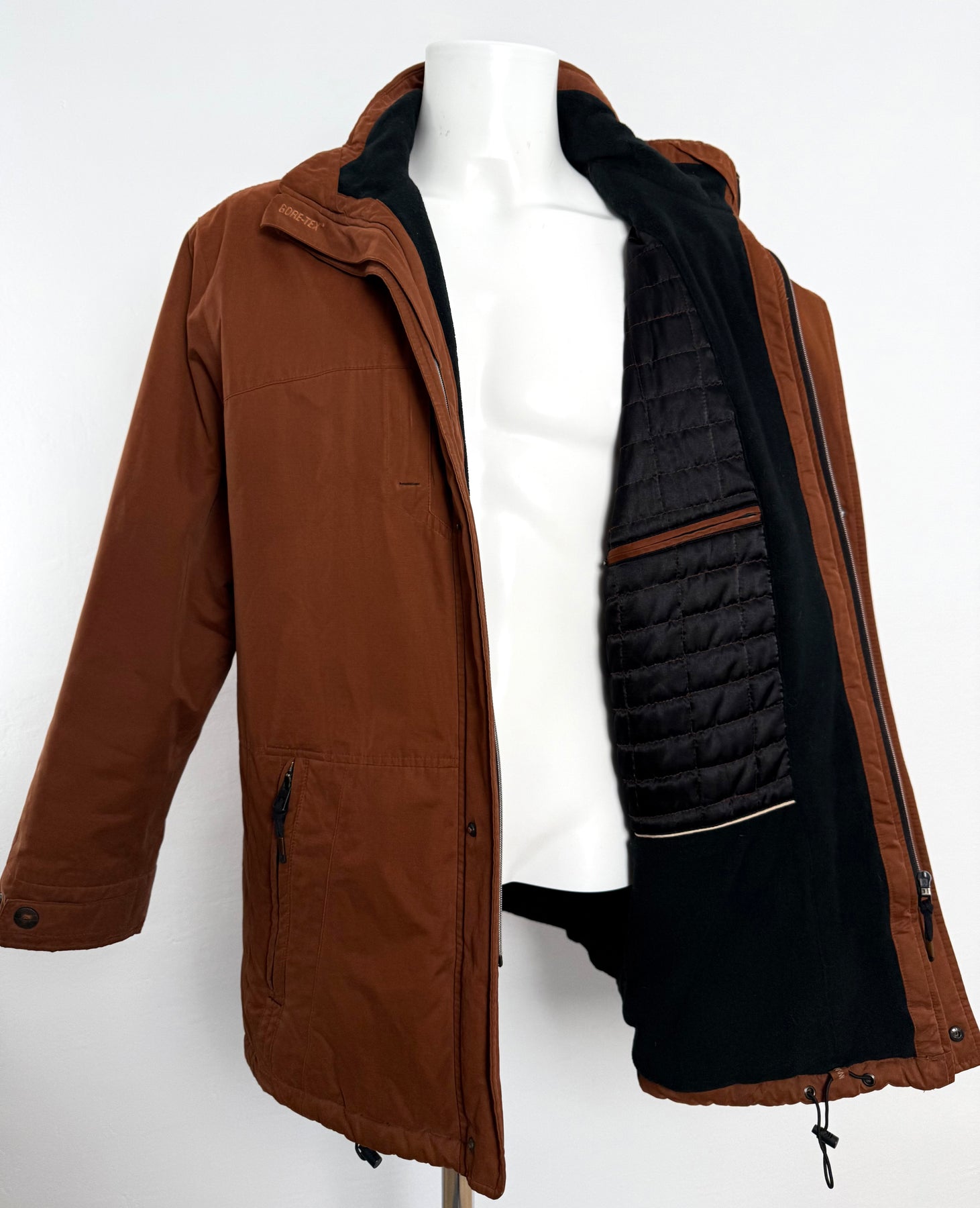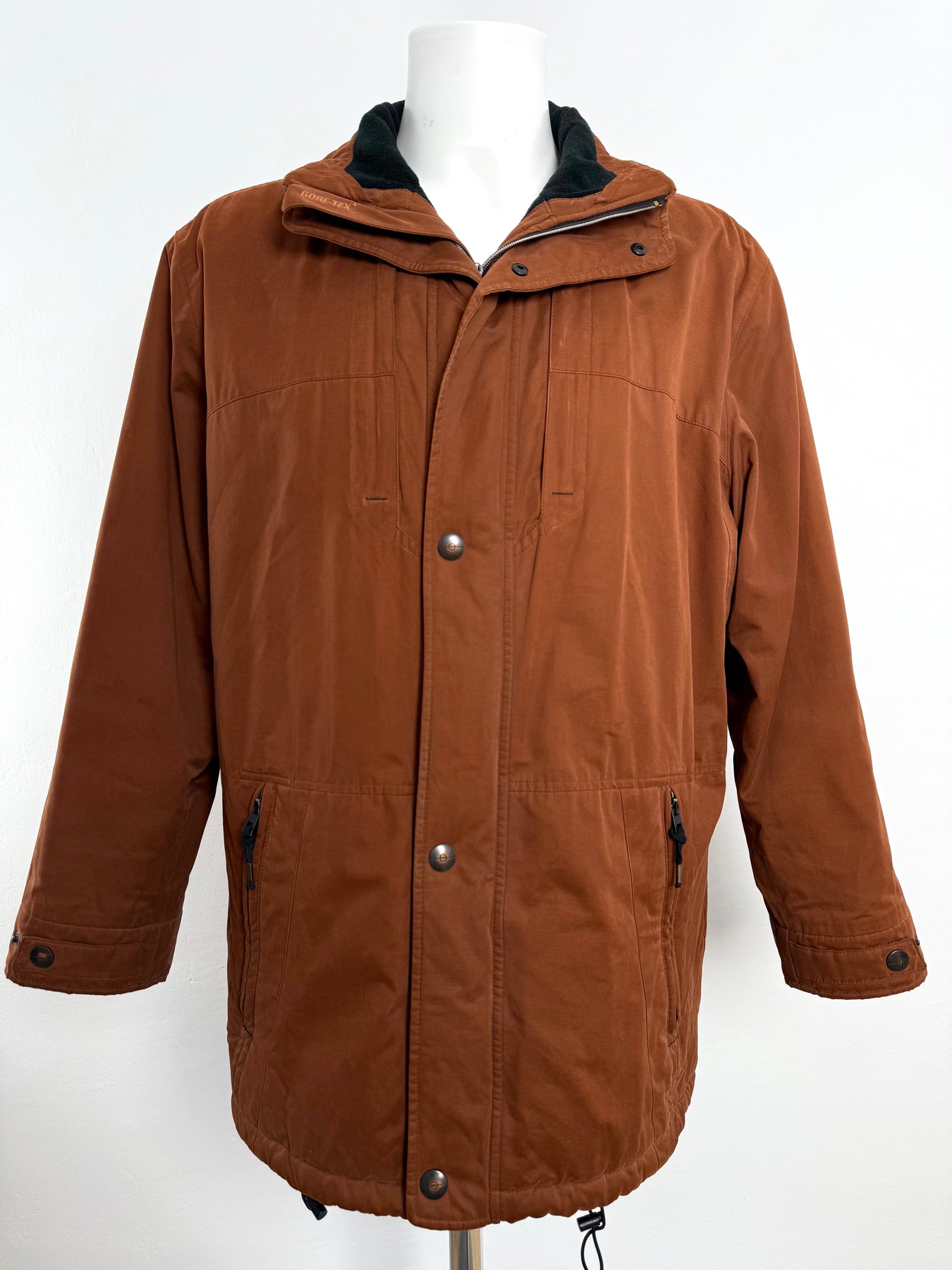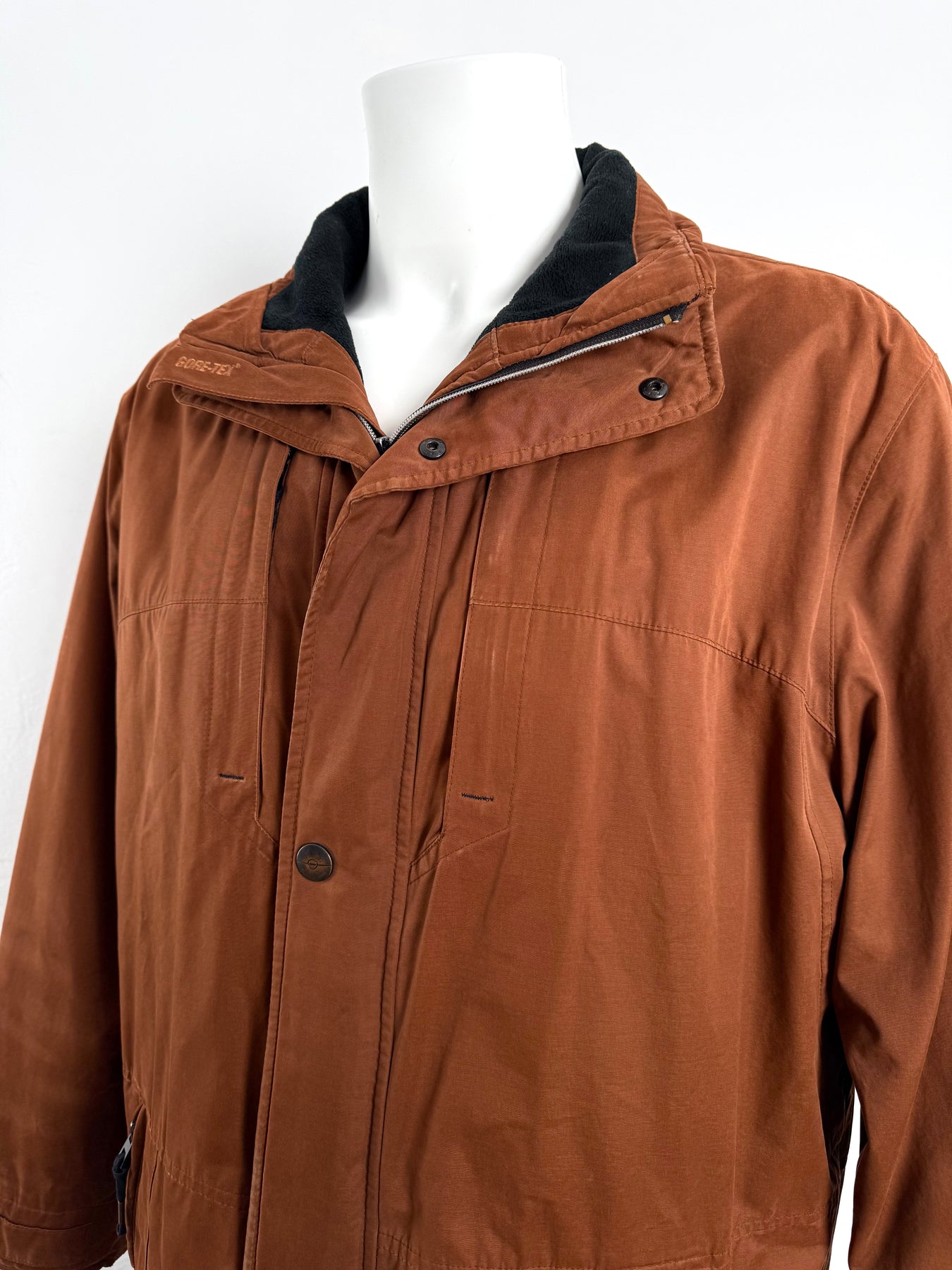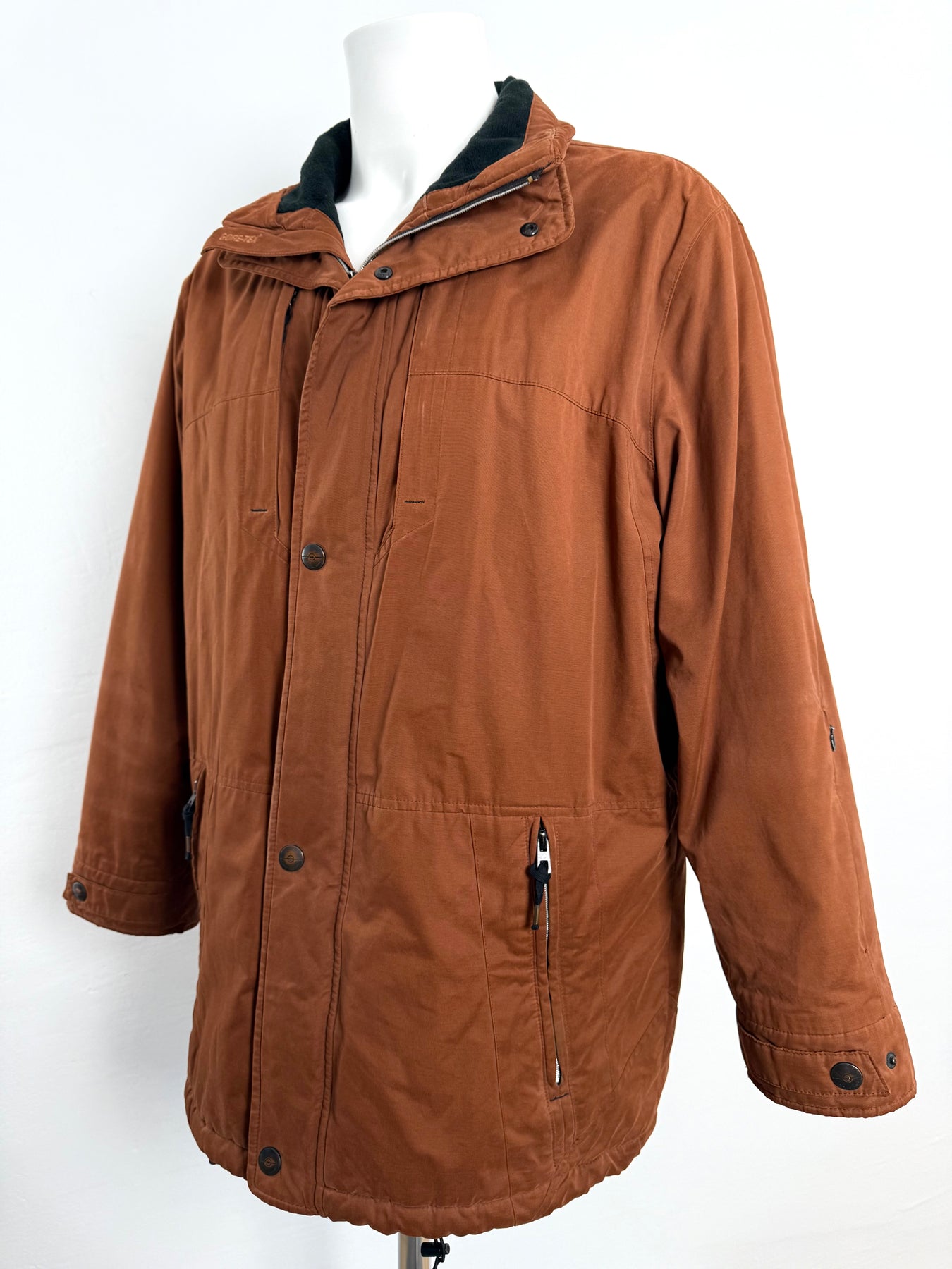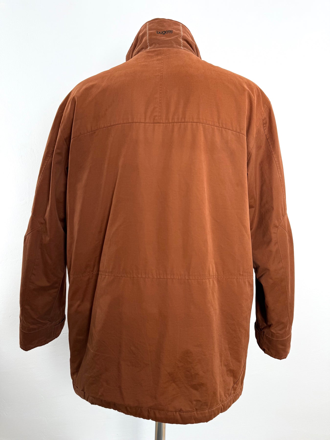 Abrigo con tecnología Goretex Bugatti color marrón talla 50 (L)en muy buen estado (pequeñas marcas de uso como se ve en las imágenes). Gran calidad de algodón, poliéster y poliamida con forro interior de poliéster, cuenta con todos los botones y cremalleras originales.