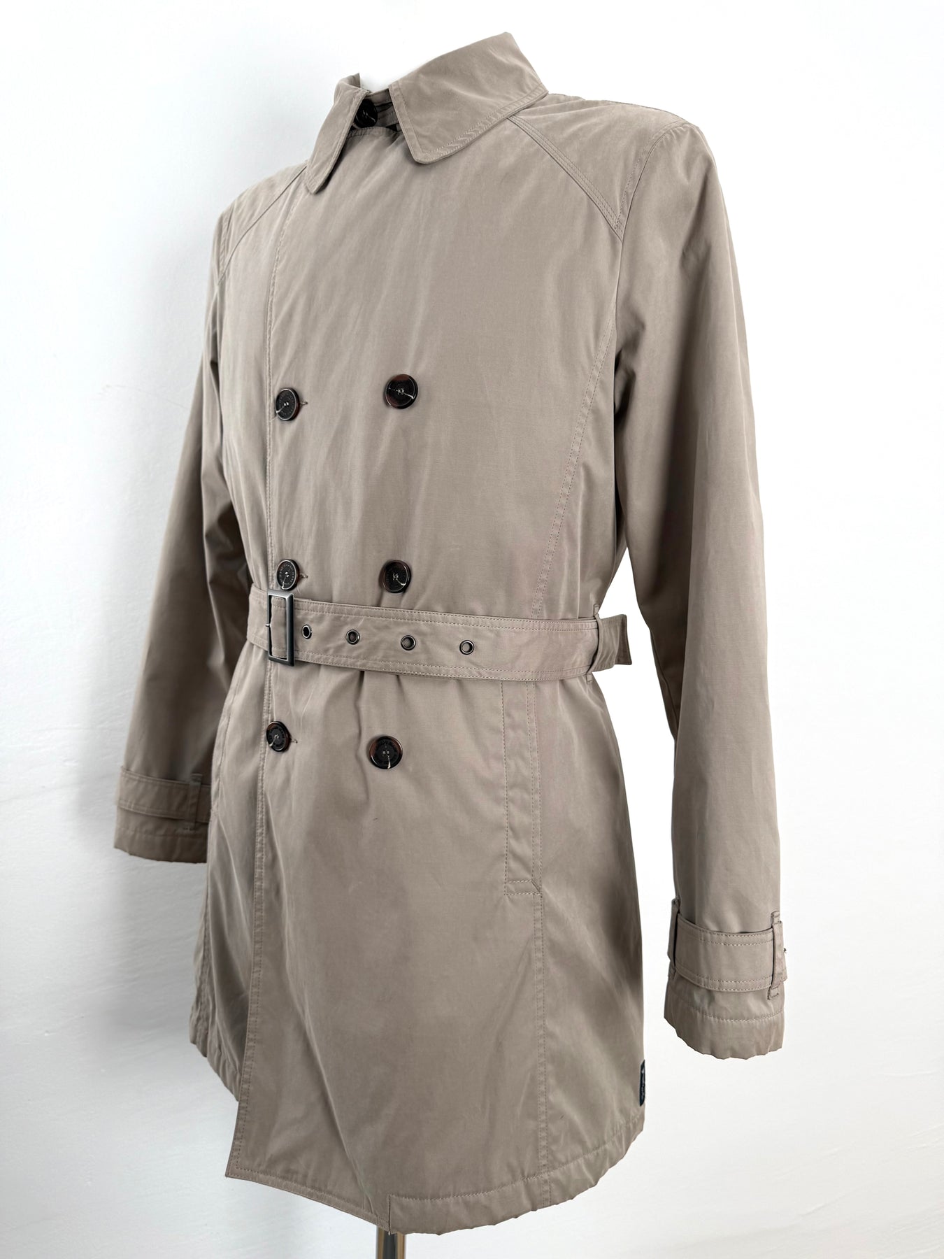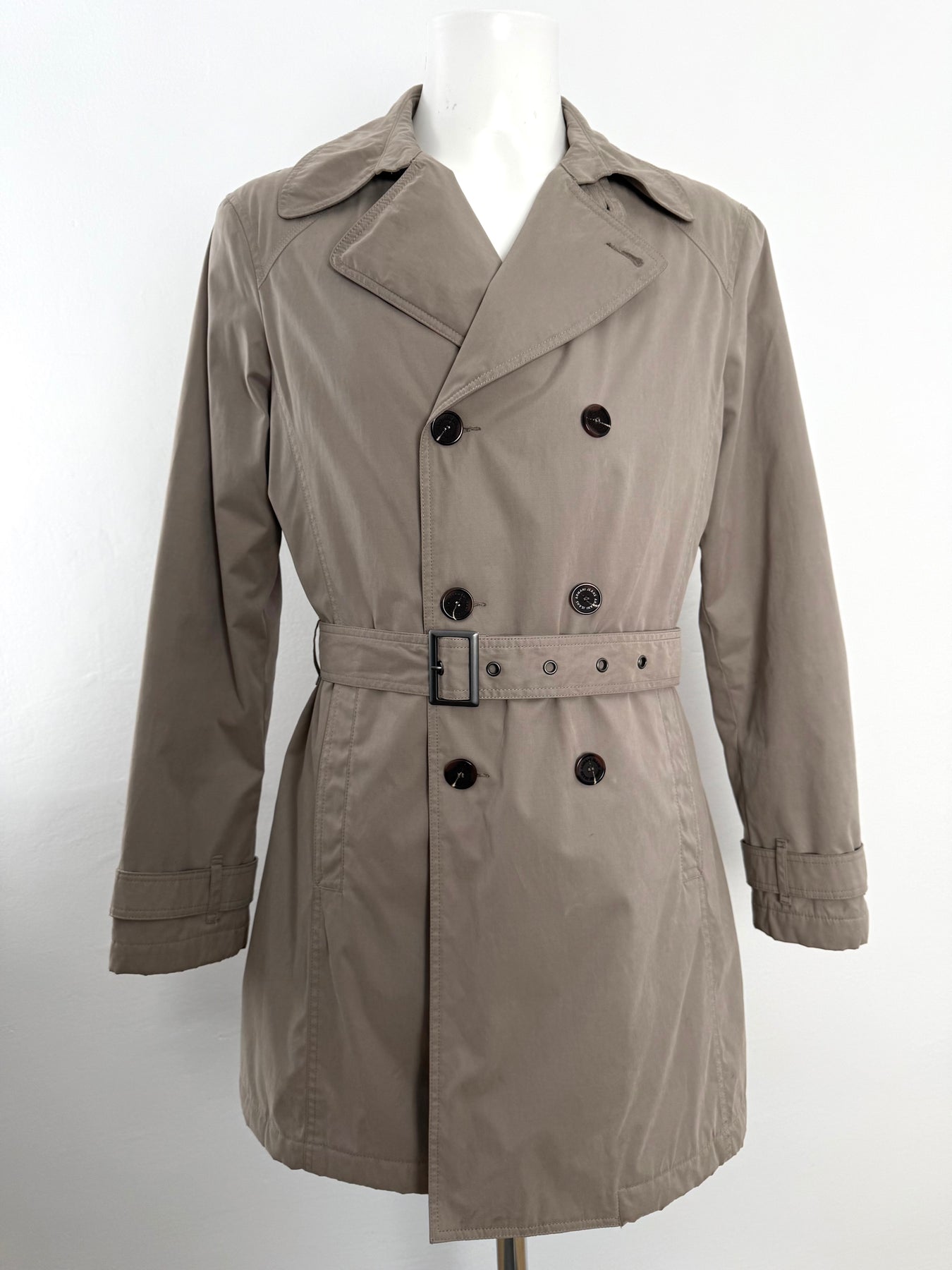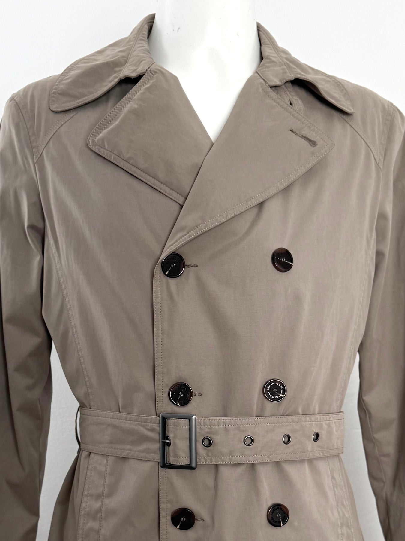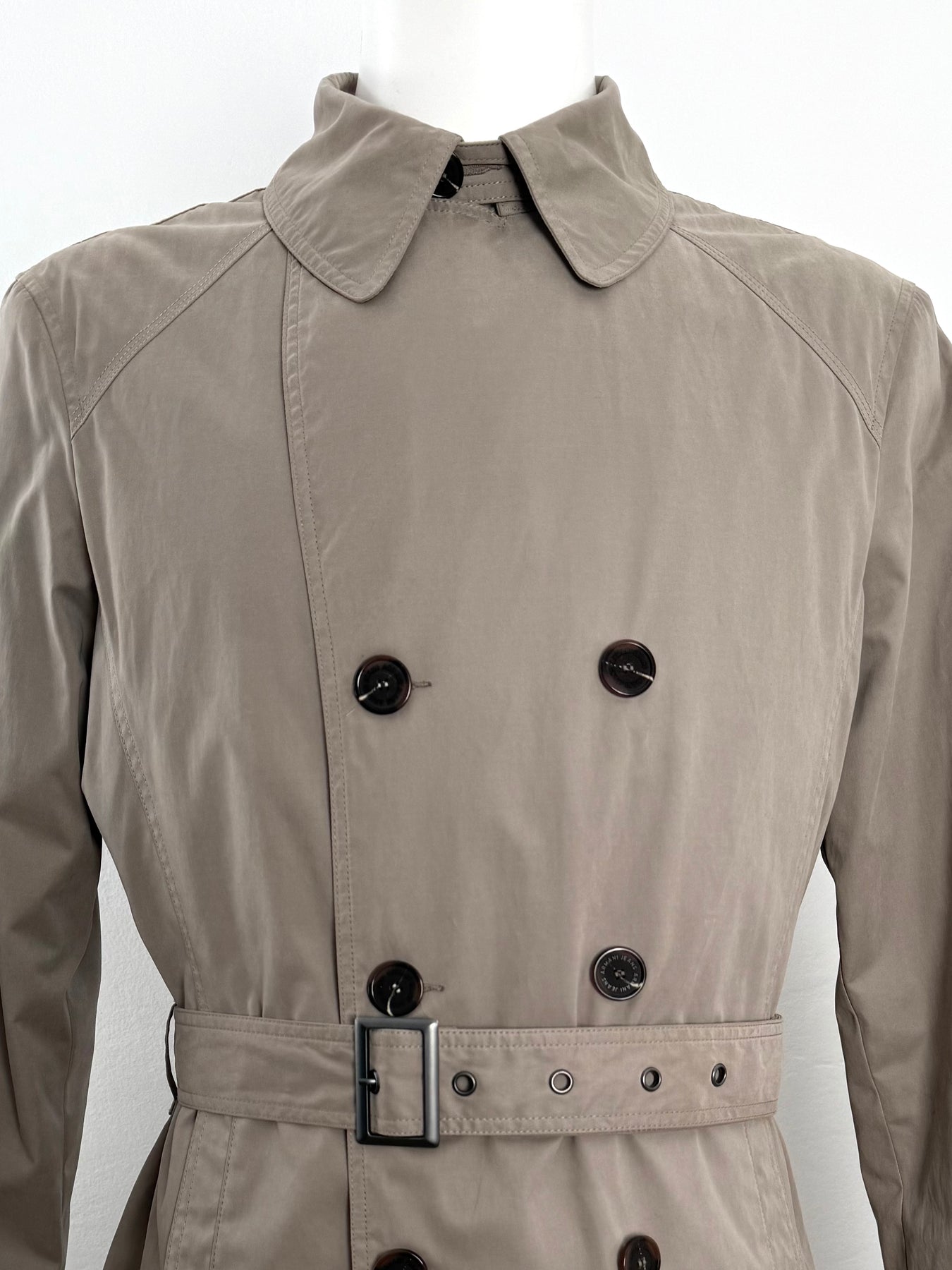 Gabardina Armani Jeans color beige talla 52 (M, aunque en la etiqueta marque una L) en perfecto estado (prácticamente nuevo con poco uso). Gran calidad de algodón, poliamida y poliéster con forro interior de poliamida y relleno de poliéster, cuenta con todos los botones originales.