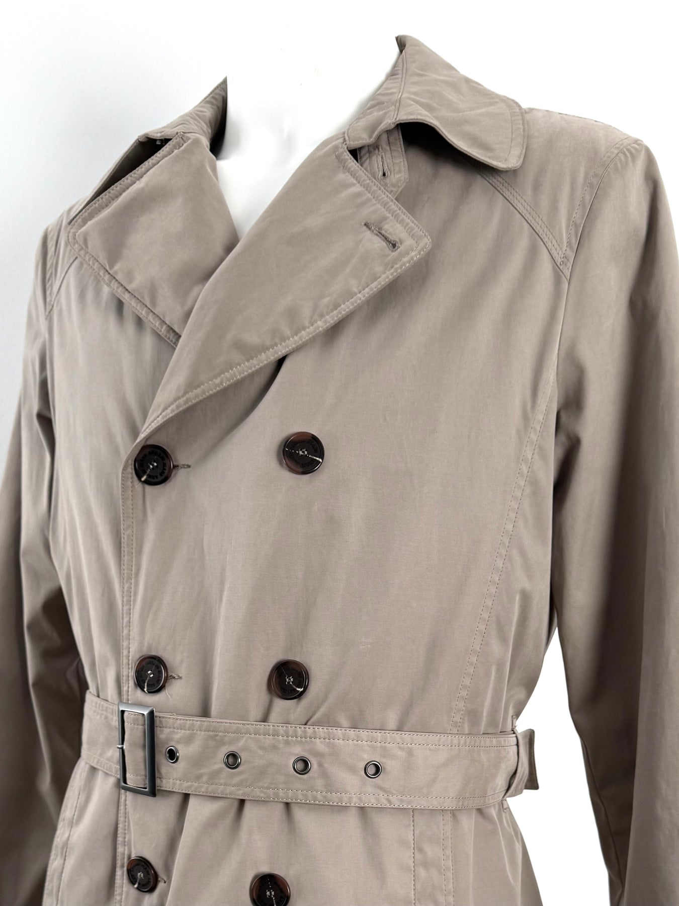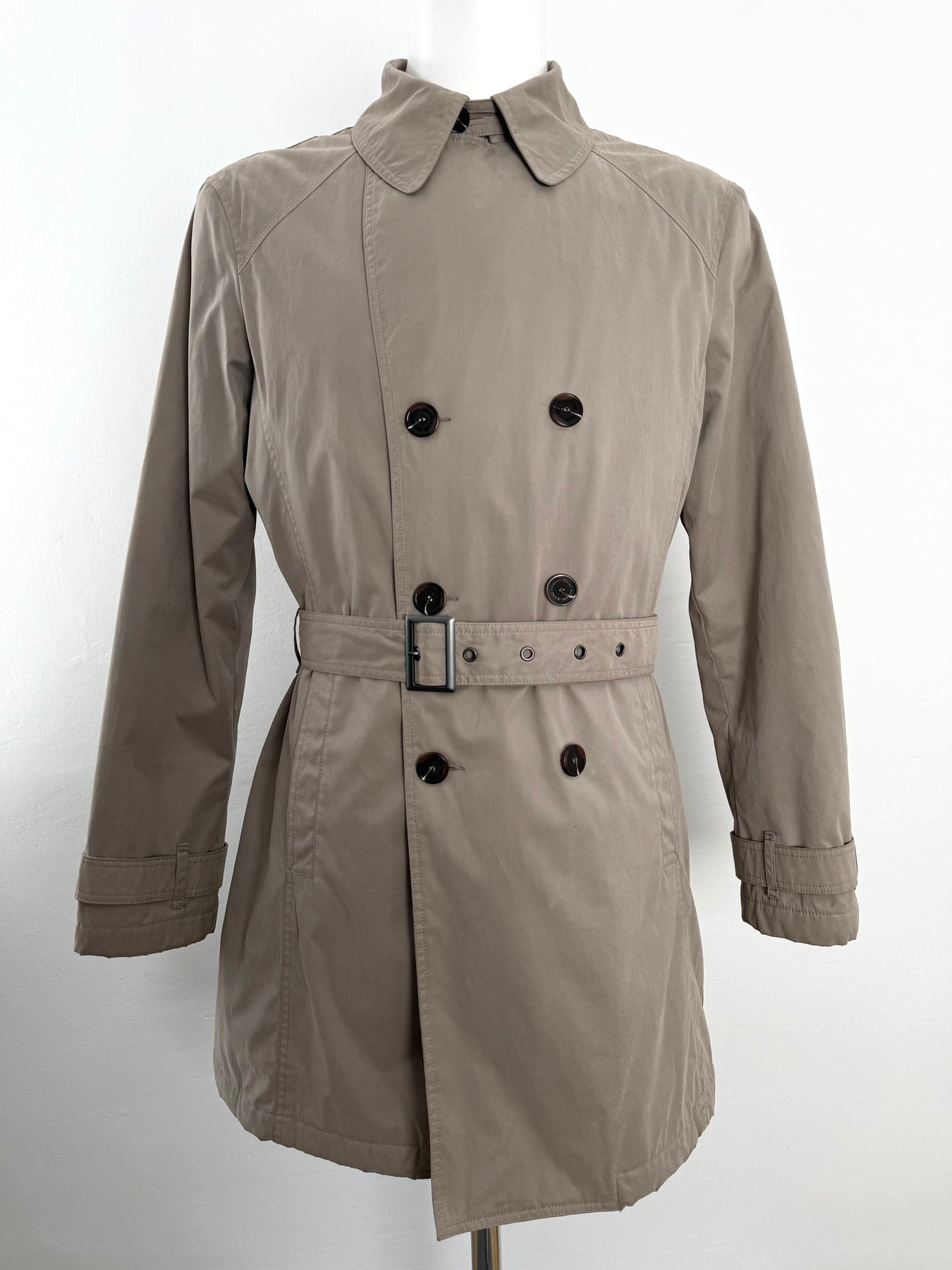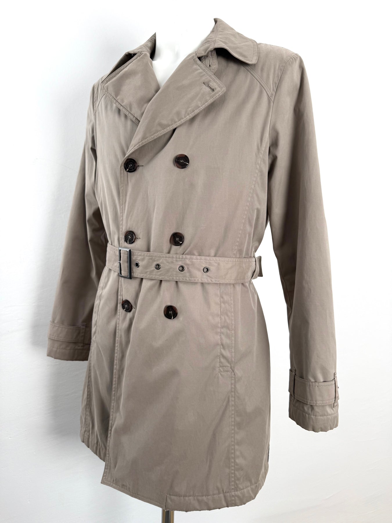 Gabardina Armani Jeans color beige talla 52 (M, aunque en la etiqueta marque una L) en perfecto estado (prácticamente nuevo con poco uso). Gran calidad de algodón, poliamida y poliéster con forro interior de poliamida y relleno de poliéster, cuenta con todos los botones originales.