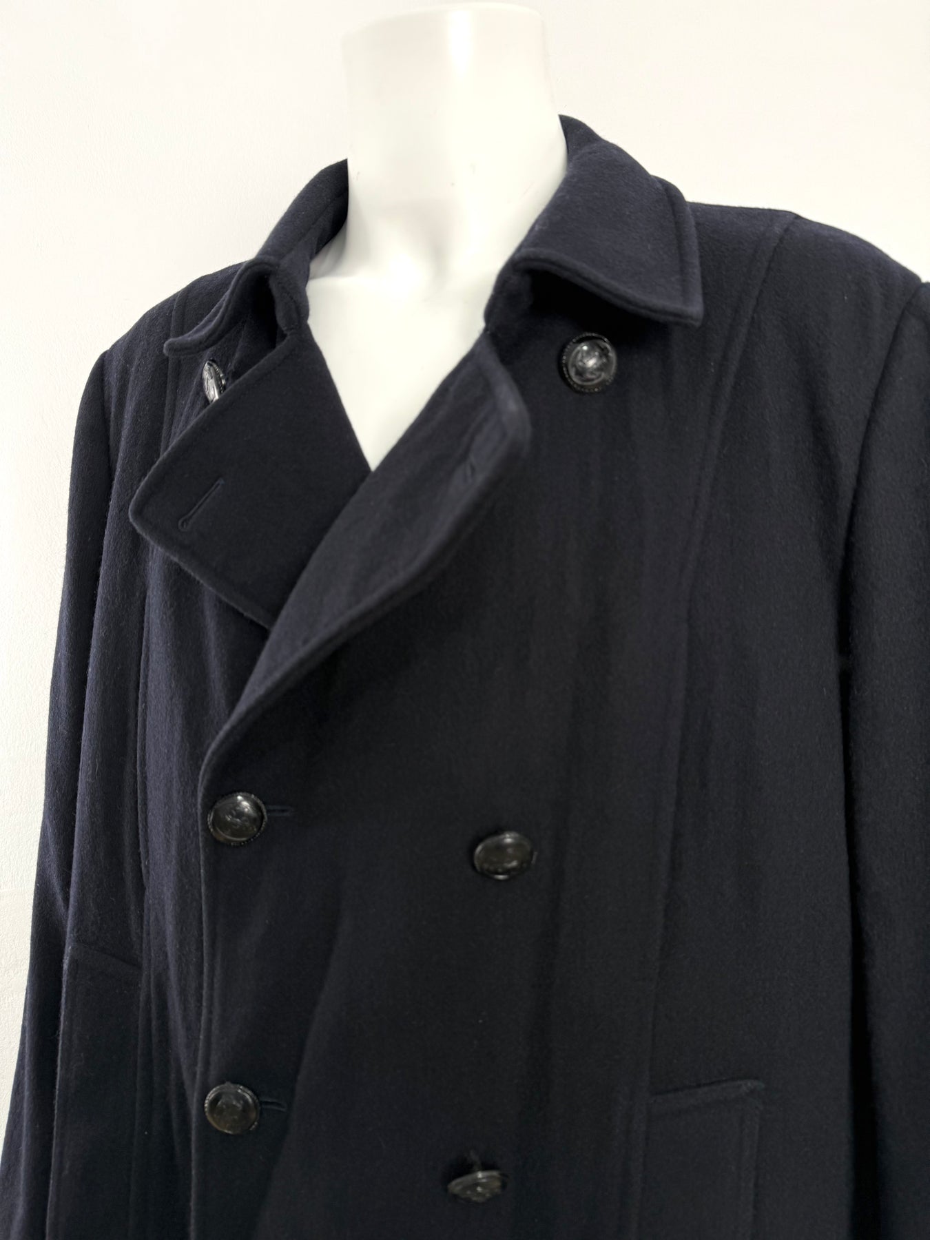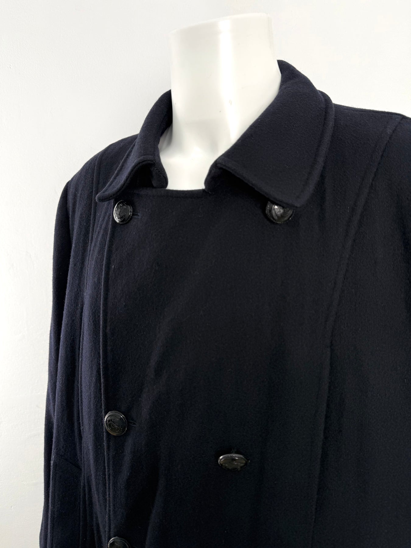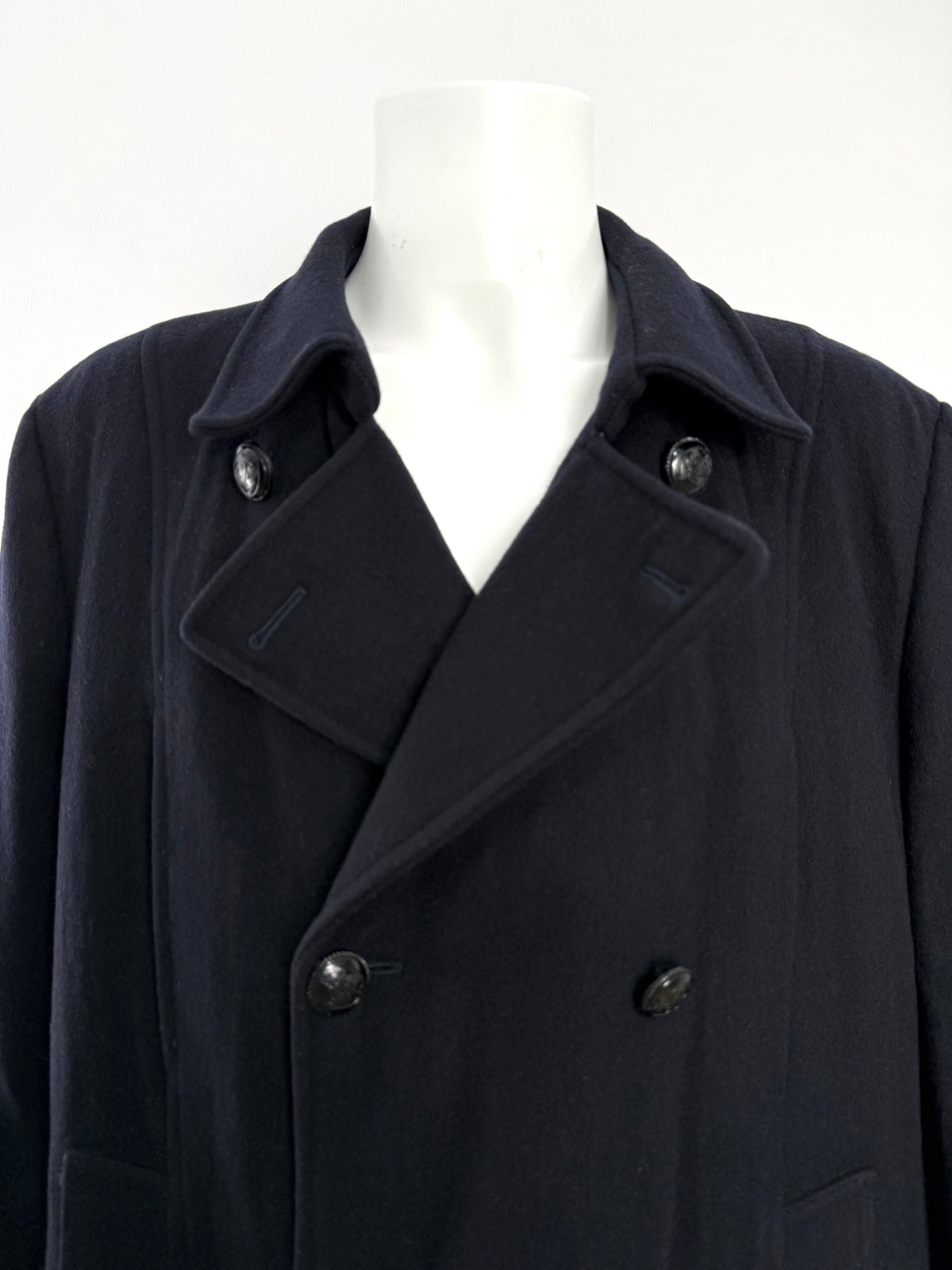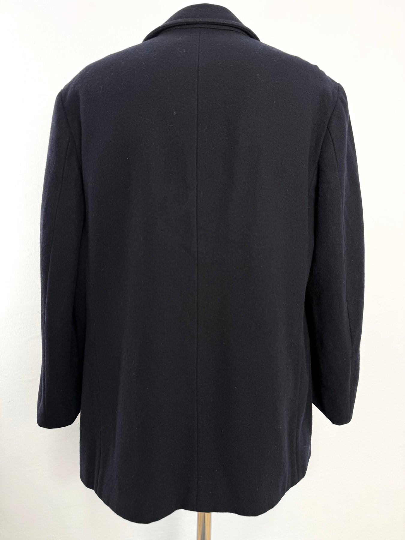 Abrigo de lana Burberrys color azul oscuro talla 52 (L) en perfecto estado (prácticamente nuevo con solo desgaste la etiqueta de composición). Gran calidad de lana y poliamida con forro interior de poliéster y viscosa, con todos los botones originales.