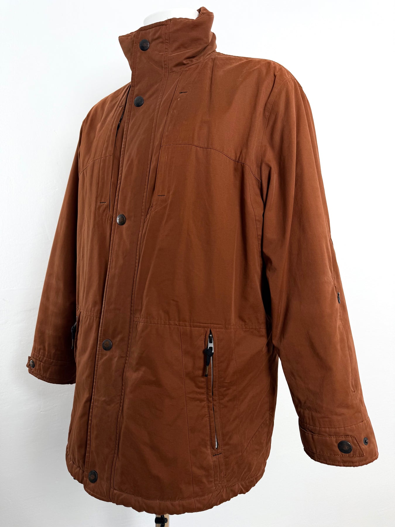 Abrigo con tecnología Goretex Bugatti color marrón talla 50 (L)en muy buen estado (pequeñas marcas de uso como se ve en las imágenes). Gran calidad de algodón, poliéster y poliamida con forro interior de poliéster, cuenta con todos los botones y cremalleras originales.