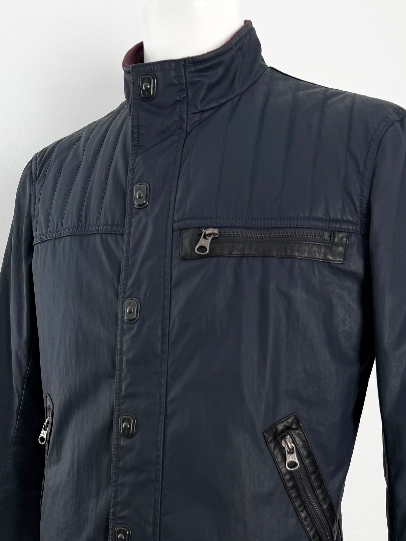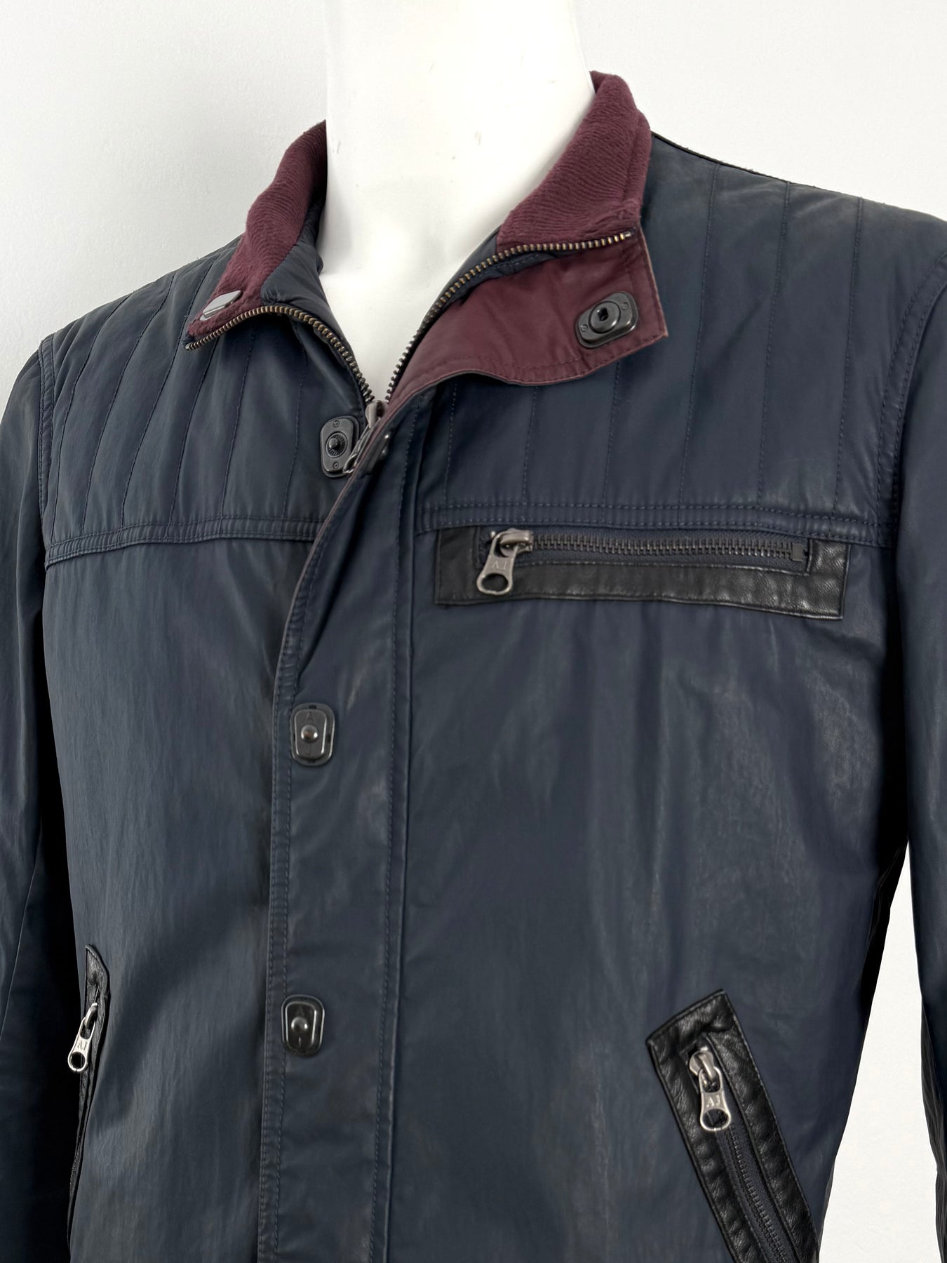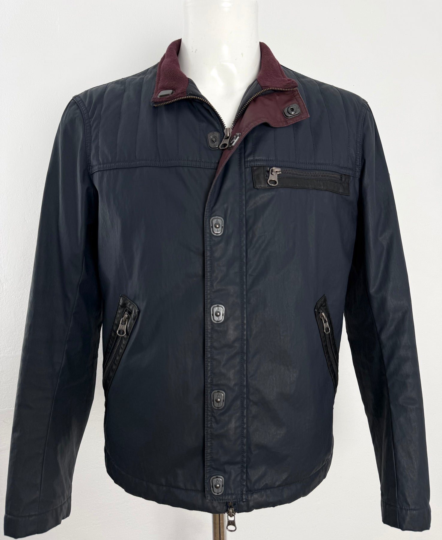 Cazadora acolchada Armani Jeans color azul oscuro talla 52 (M) en perfecto estado (prácticamente nuevo con poco uso, etiqueta de composición cortada). Gran calidad de poliéster, cuenta con todos los botones y cremalleras originales.